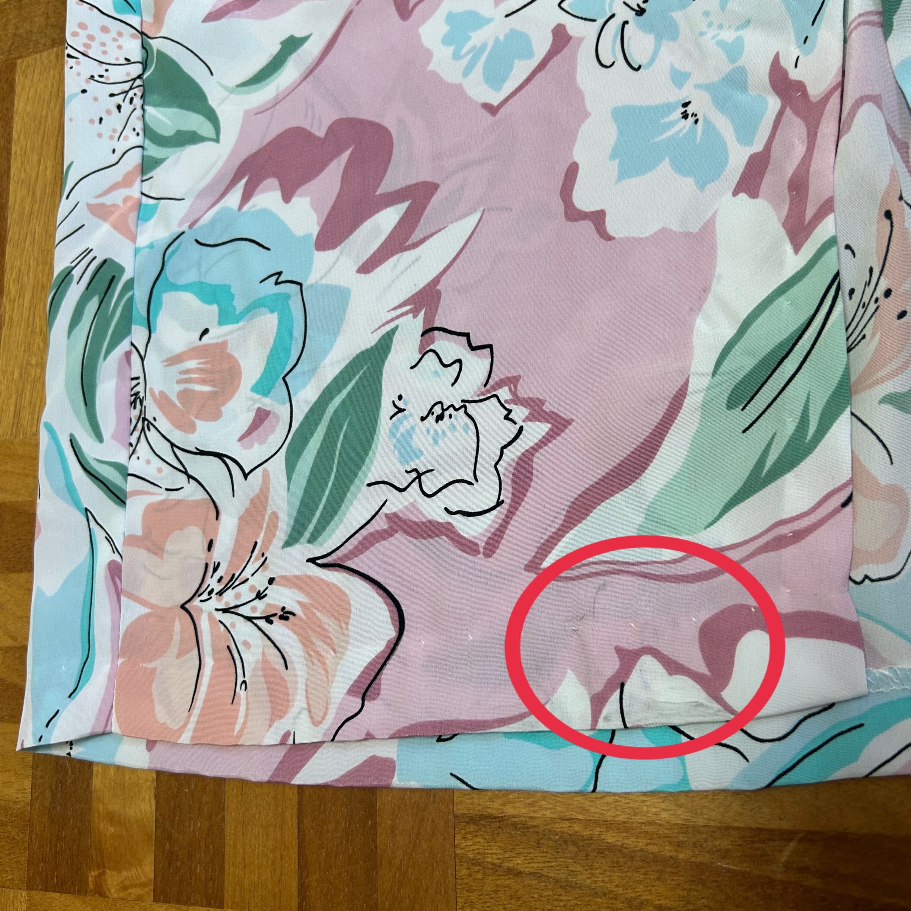透け感あるので、ペチコート着用下さい。ベルトループありますが、付属品なし。ウエストゴム伸びています。バック右袖、バック裾に薄汚れ数カ所あり。
