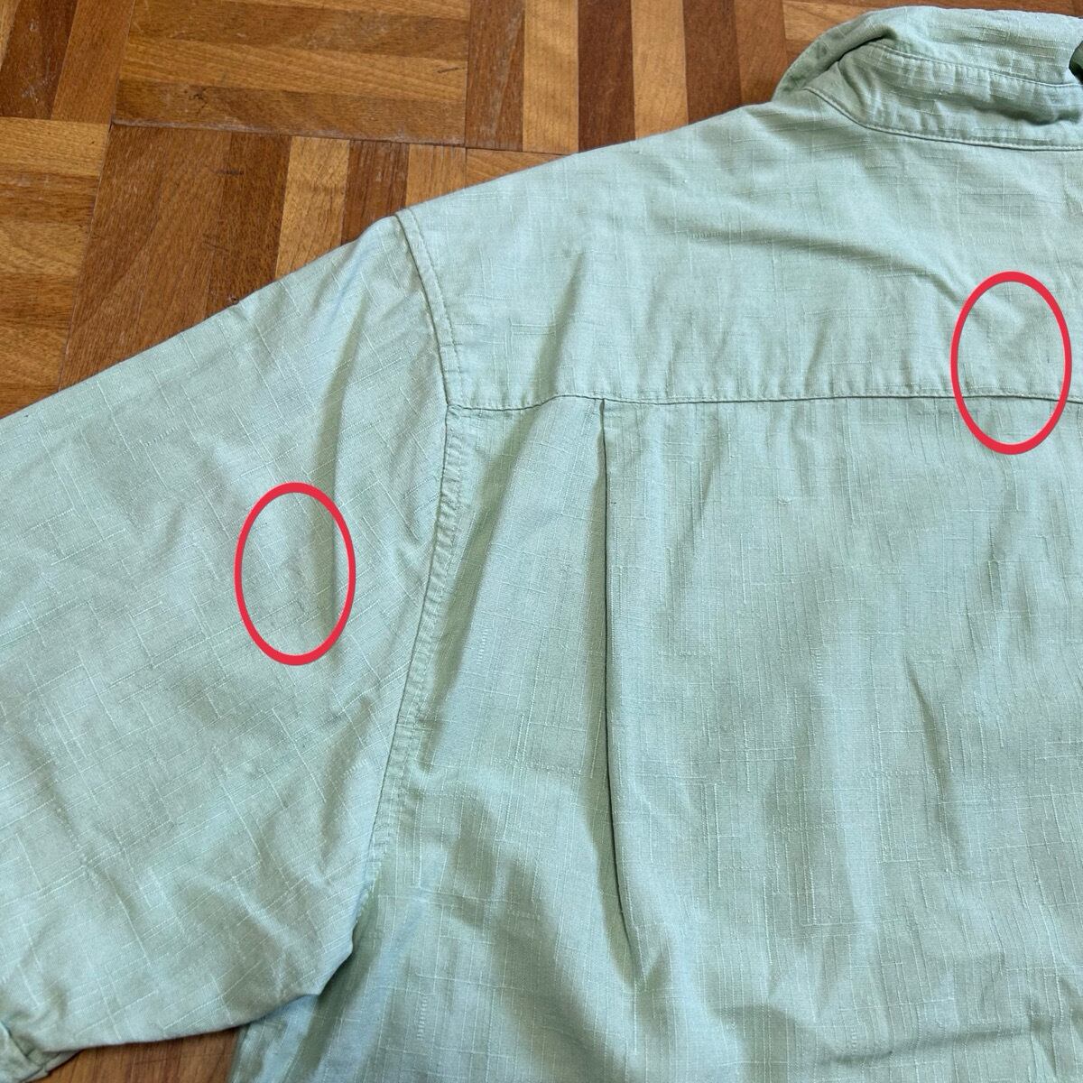 生地特有のネップ数カ所あり。袖、左袖付け横、胸、お腹、背中に薄汚れではありませんが、糸が黒っぽくなっているところ数カ所あり。バック左袖、バック右サイドに薄汚れ数カ所あり。