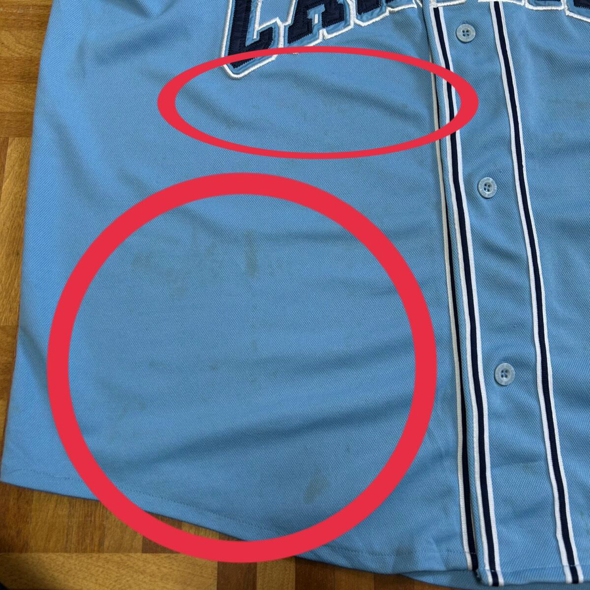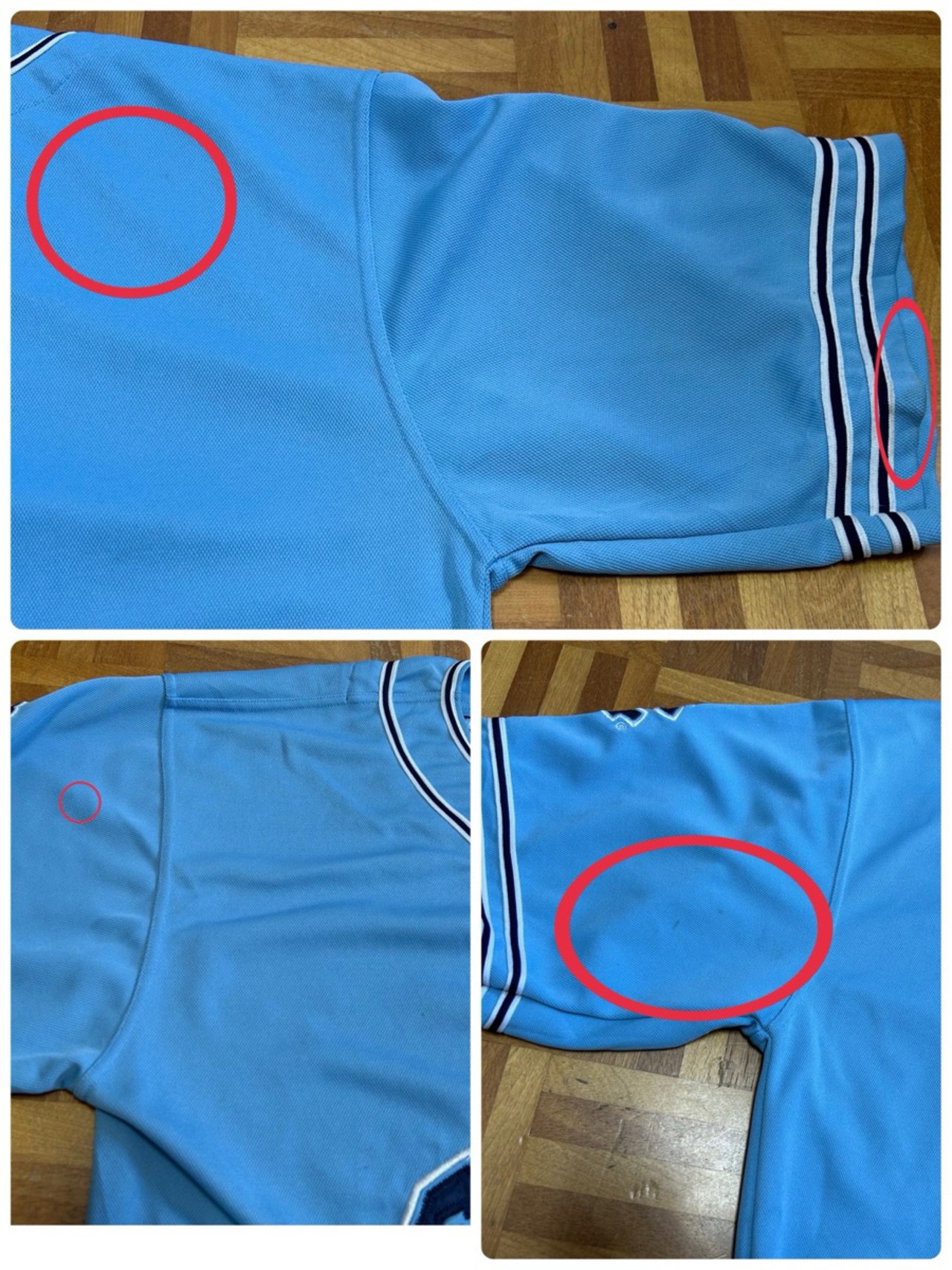 袖、首元、胸、お腹、前後裾辺り、バック右肩下に薄汚れ数カ所あり。