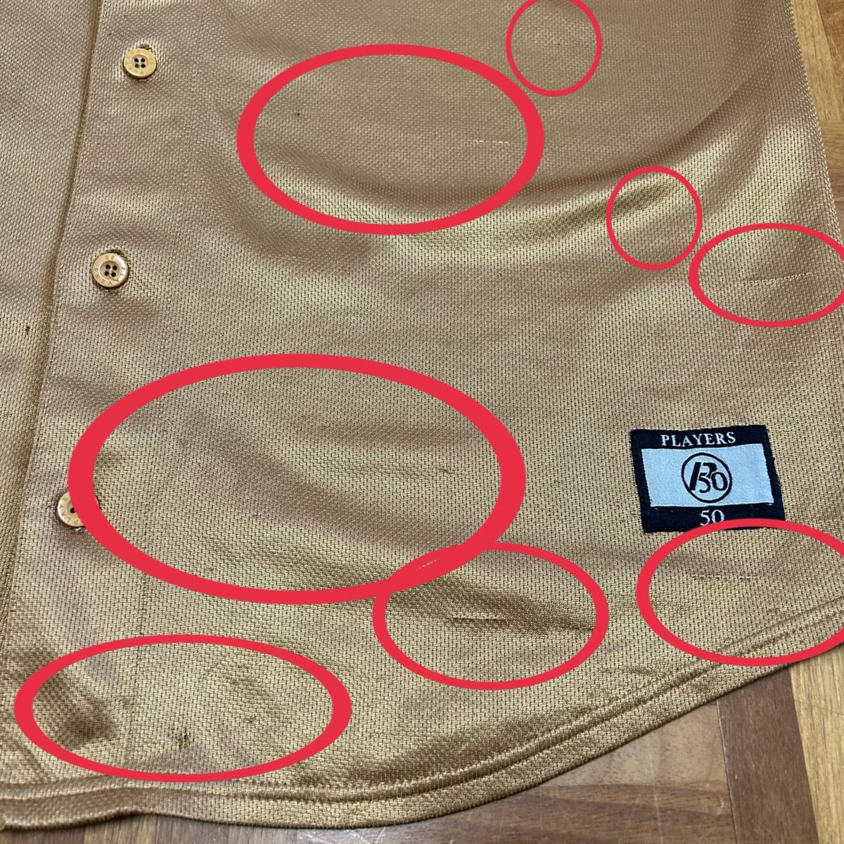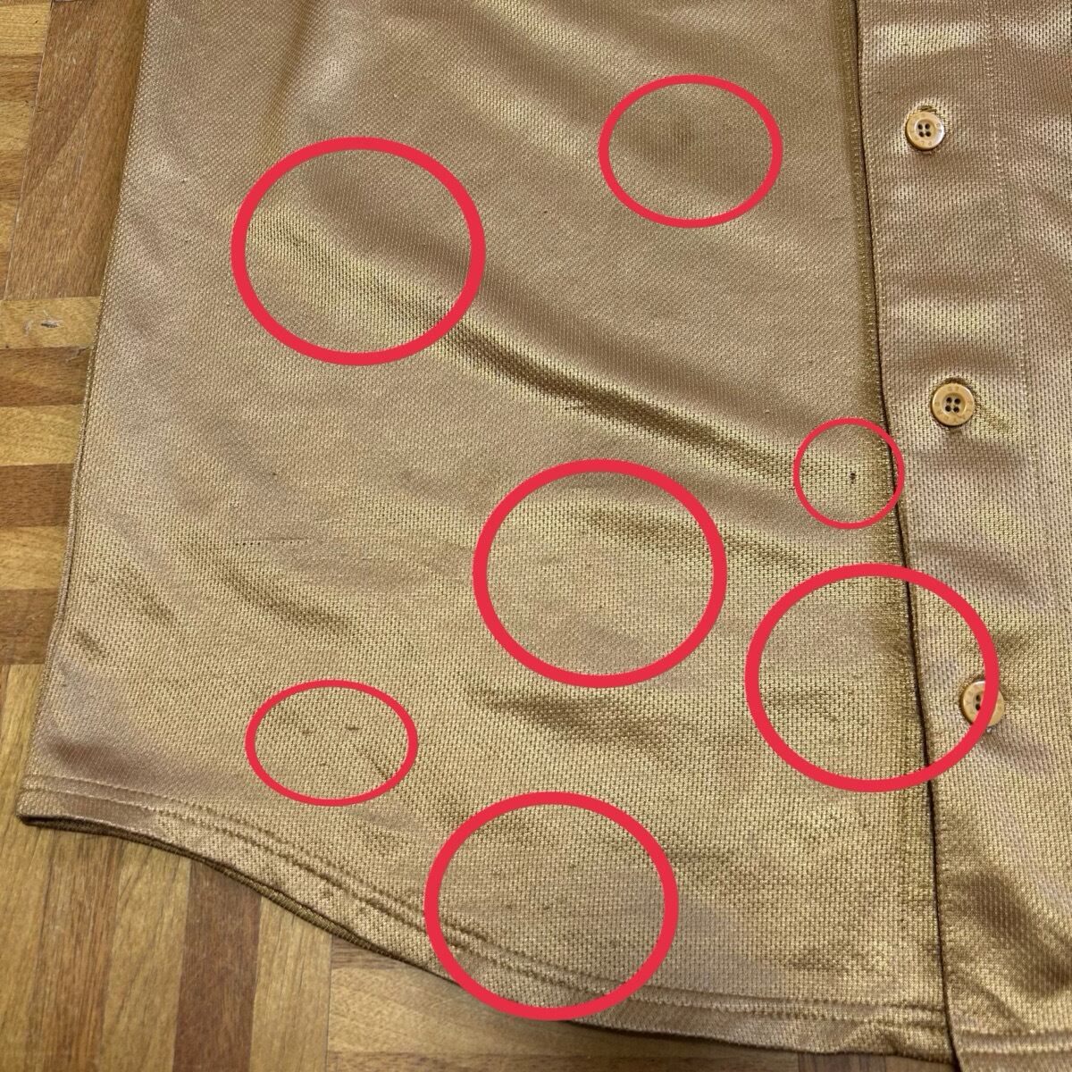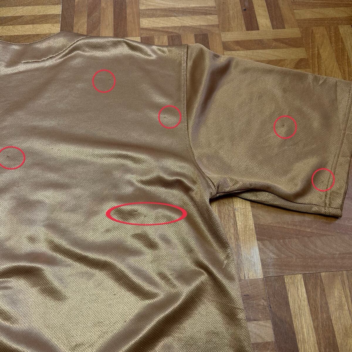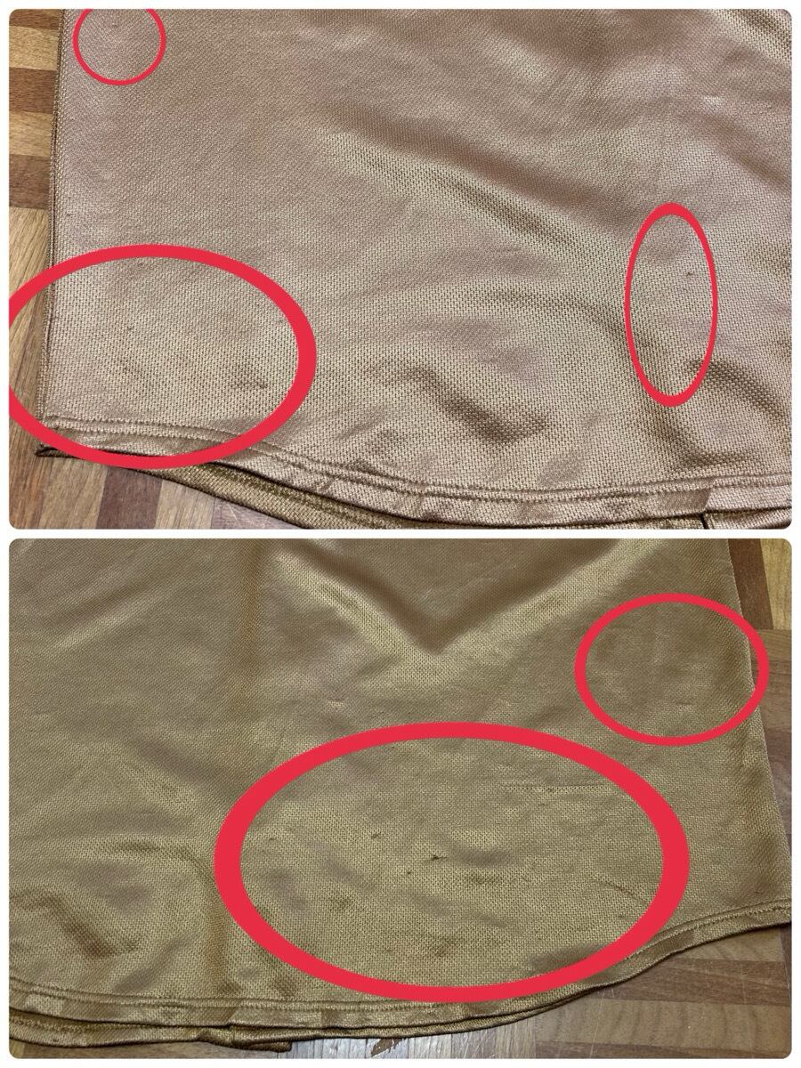 お腹に薄汚れあり。袖、胸、お腹、前後裾辺り、背中に生地引け数カ所あり。裾辺りに、5㎜程度のダメージ数カ所あり。