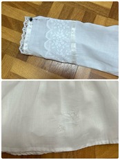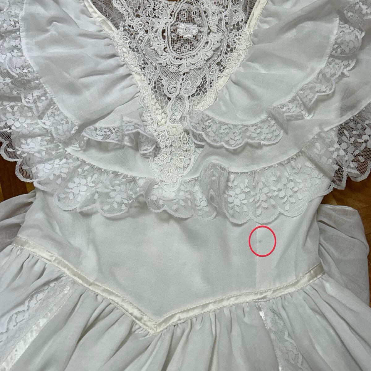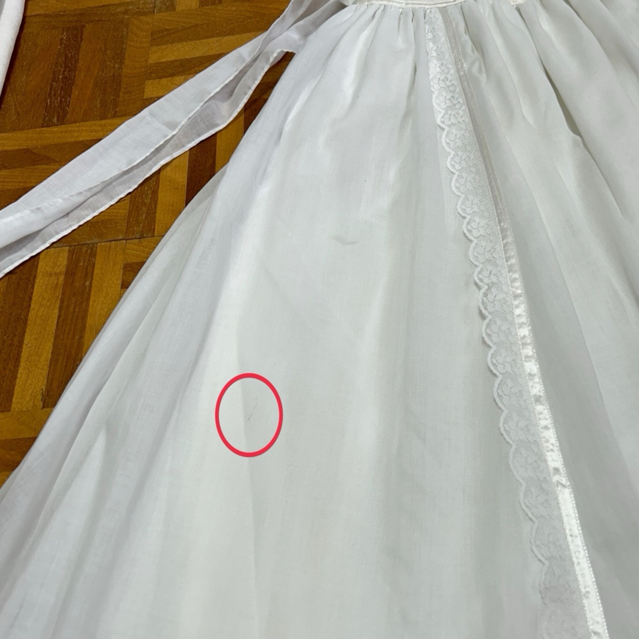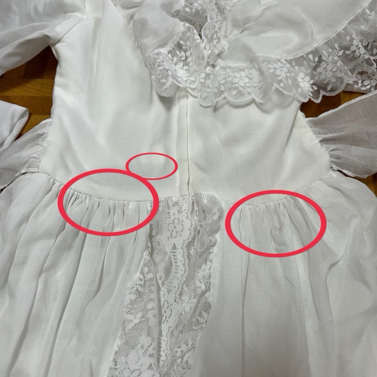 バック左袖先、ウエスト上、スカート右サイド、バックウエスト辺り、バックスカート左サイド、バック裾上に薄汚れ数カ所あり。バック裾に3㎝程度のダメージあり。