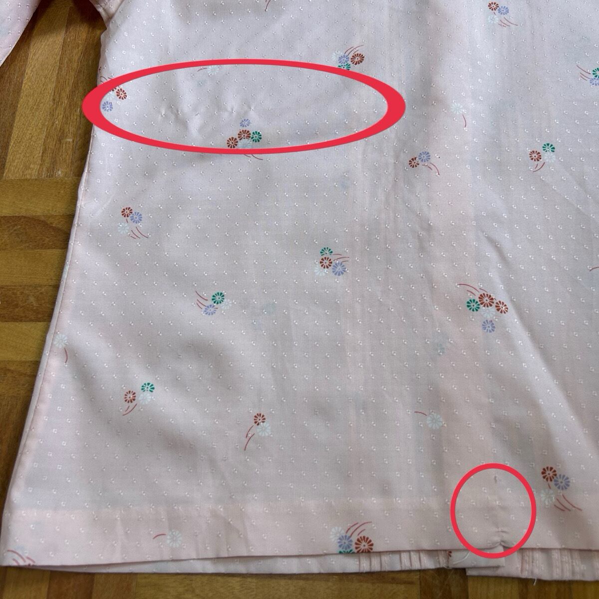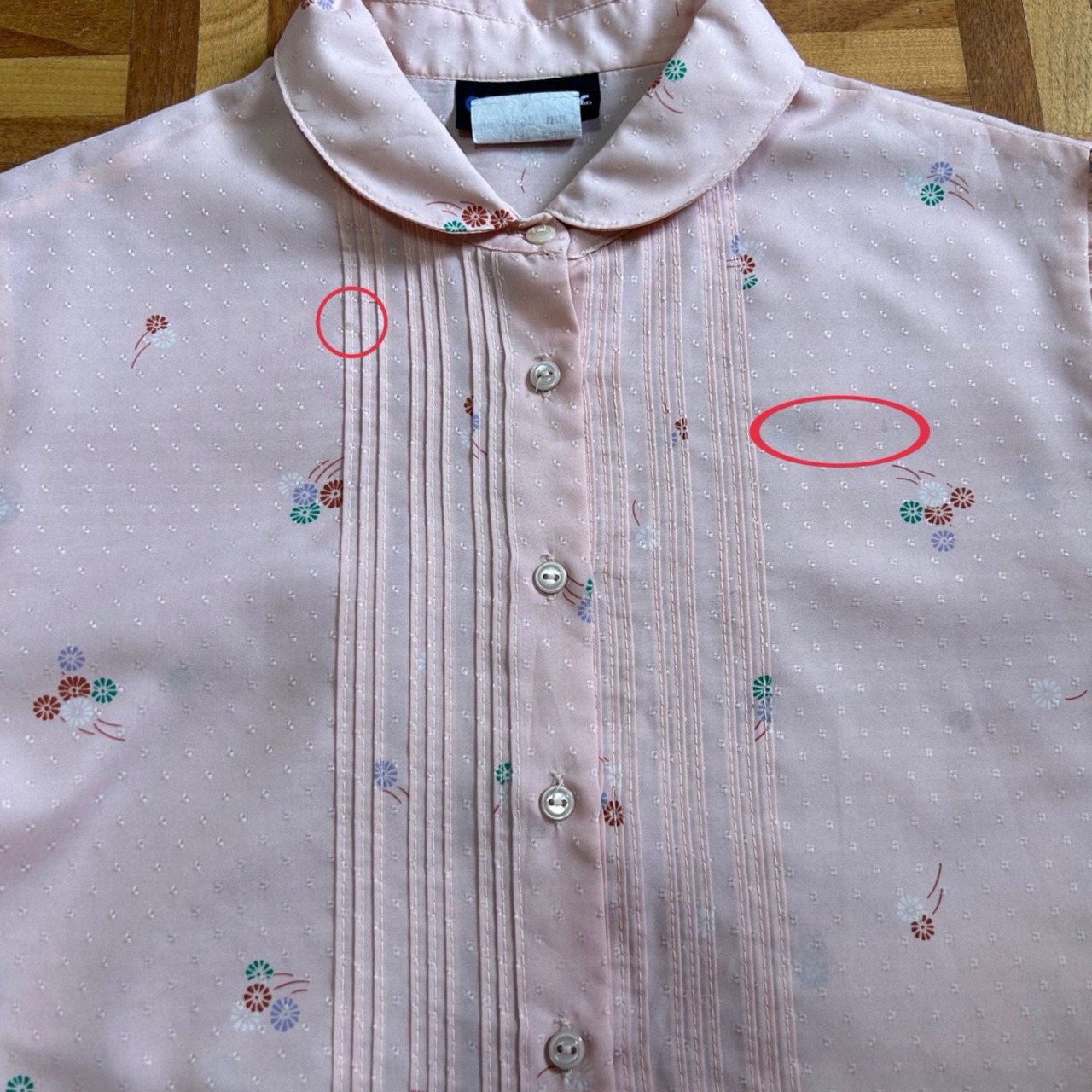 左右胸辺り、バック左袖付け横に薄汚れ数カ所あり。バック左サイド、バック裾に生地引け数カ所あり。