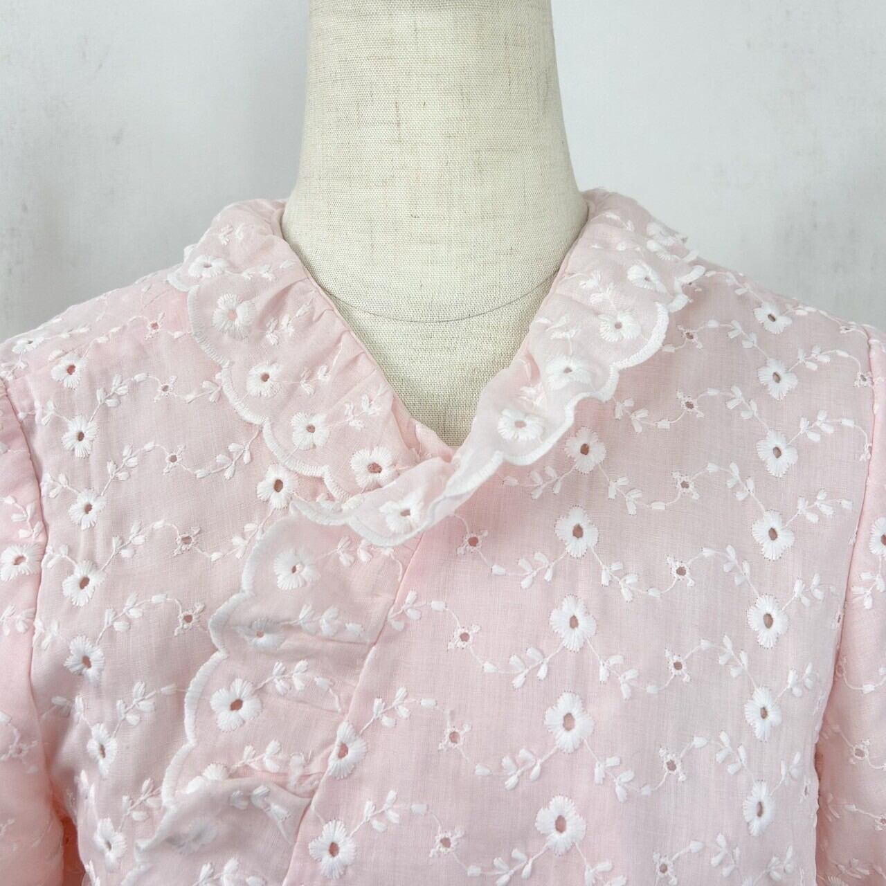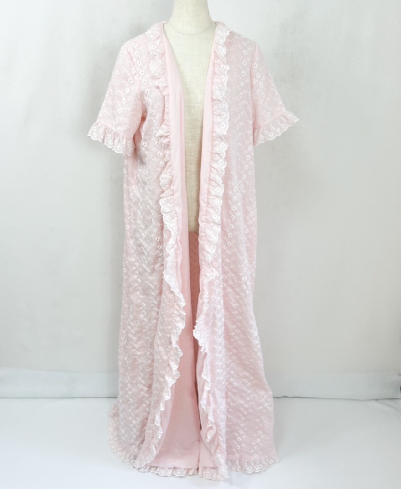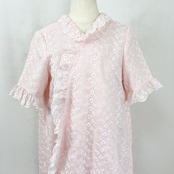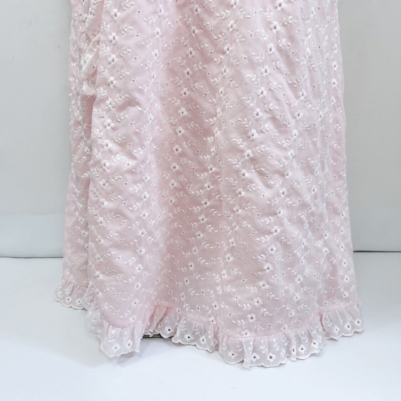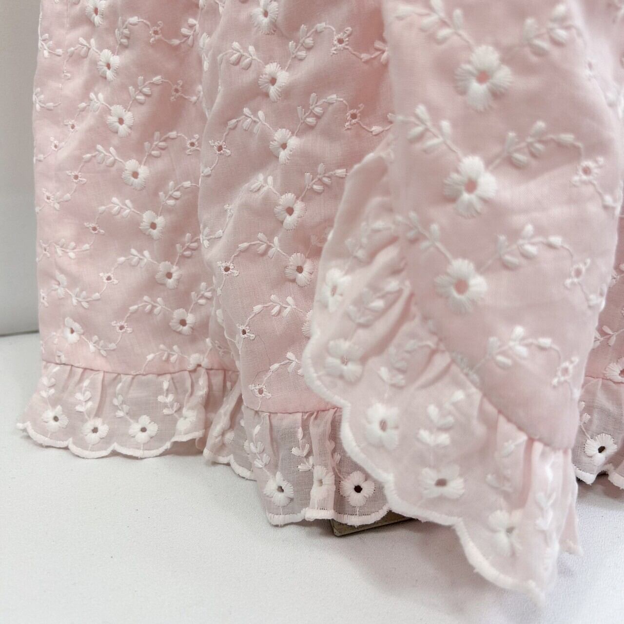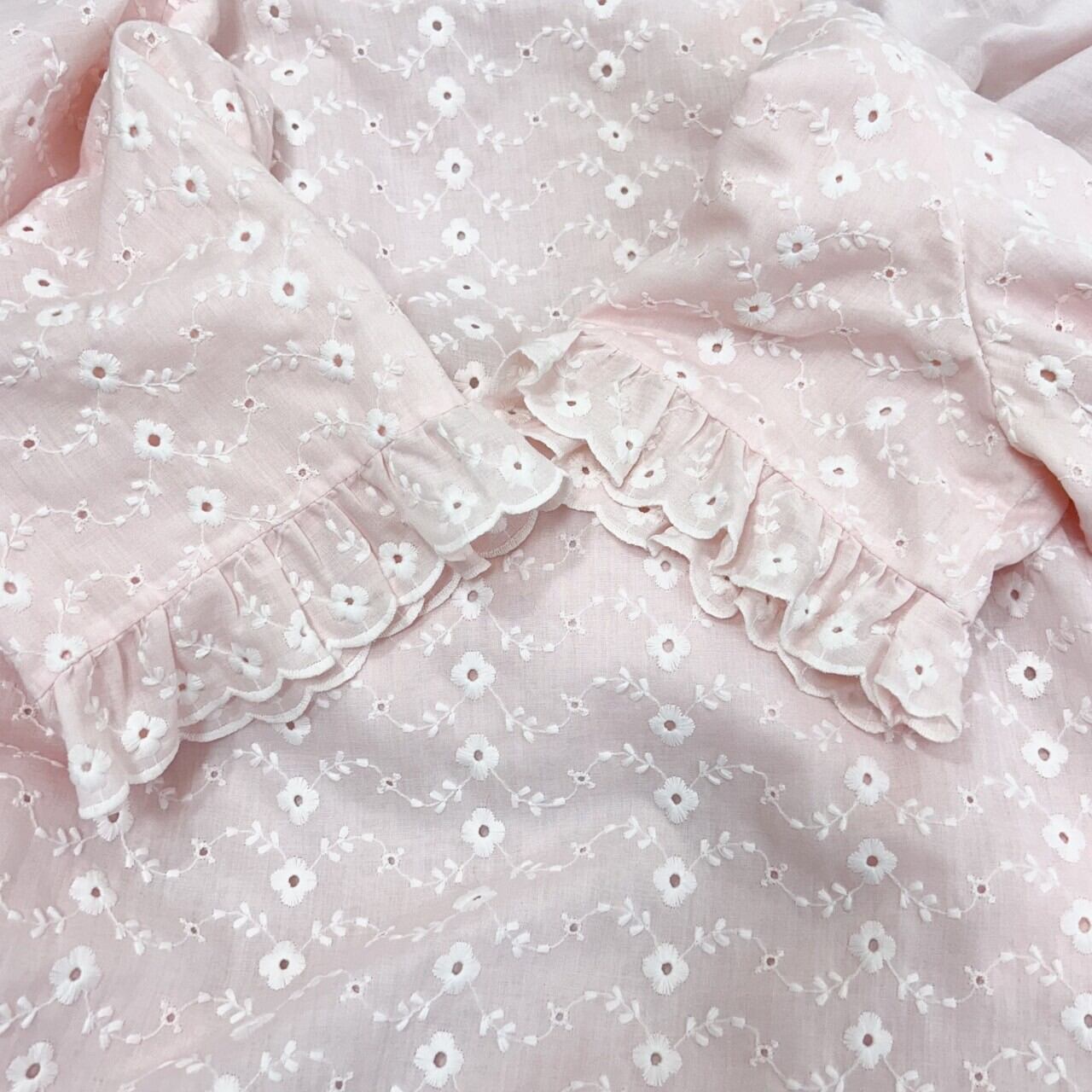 優しいピンクカラーにホワイトの花柄の総刺繍、フリルが端に施されていたりとラブリー好きにはたまりません。
