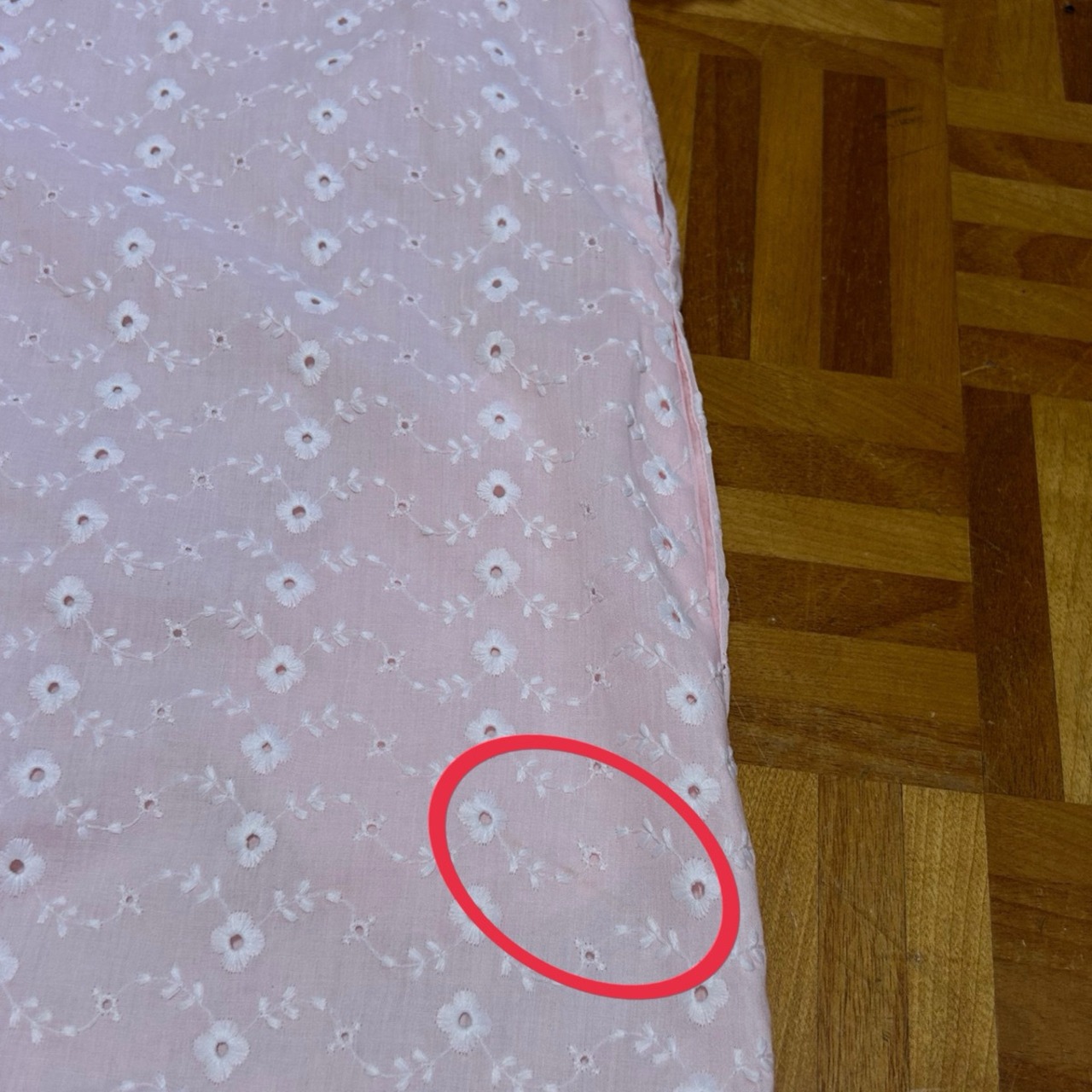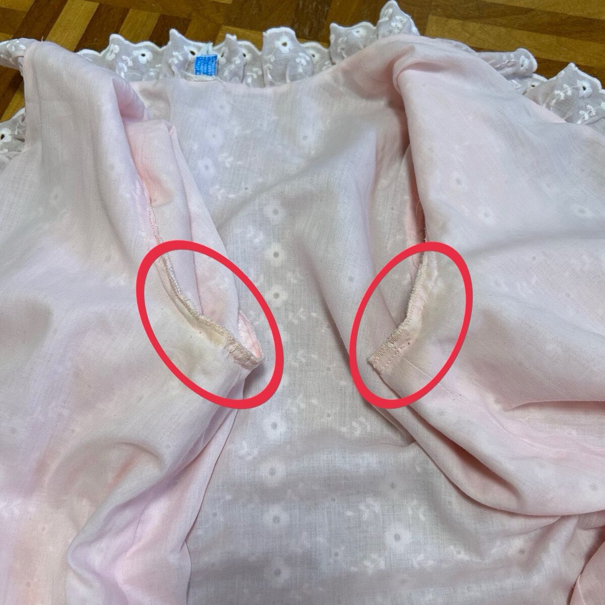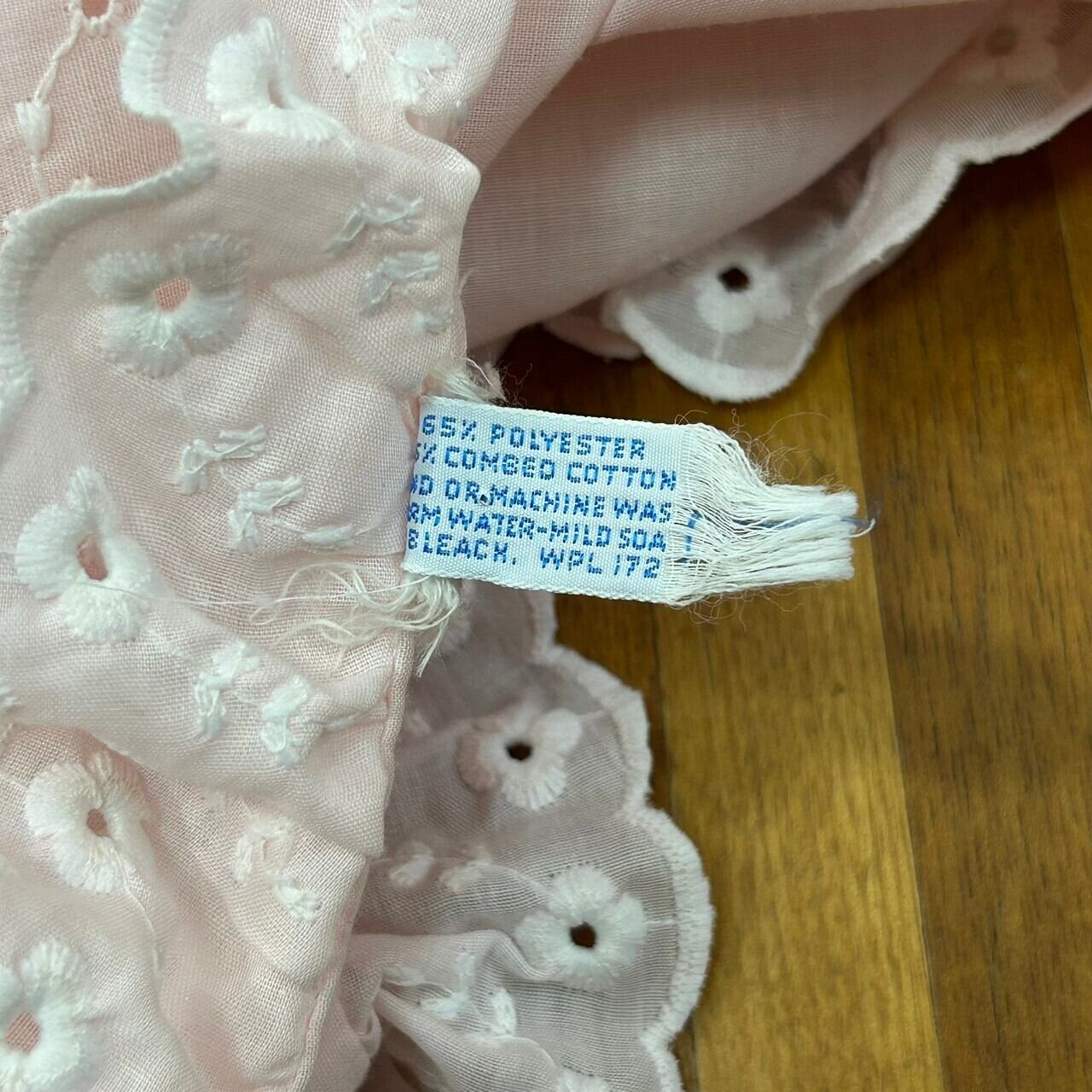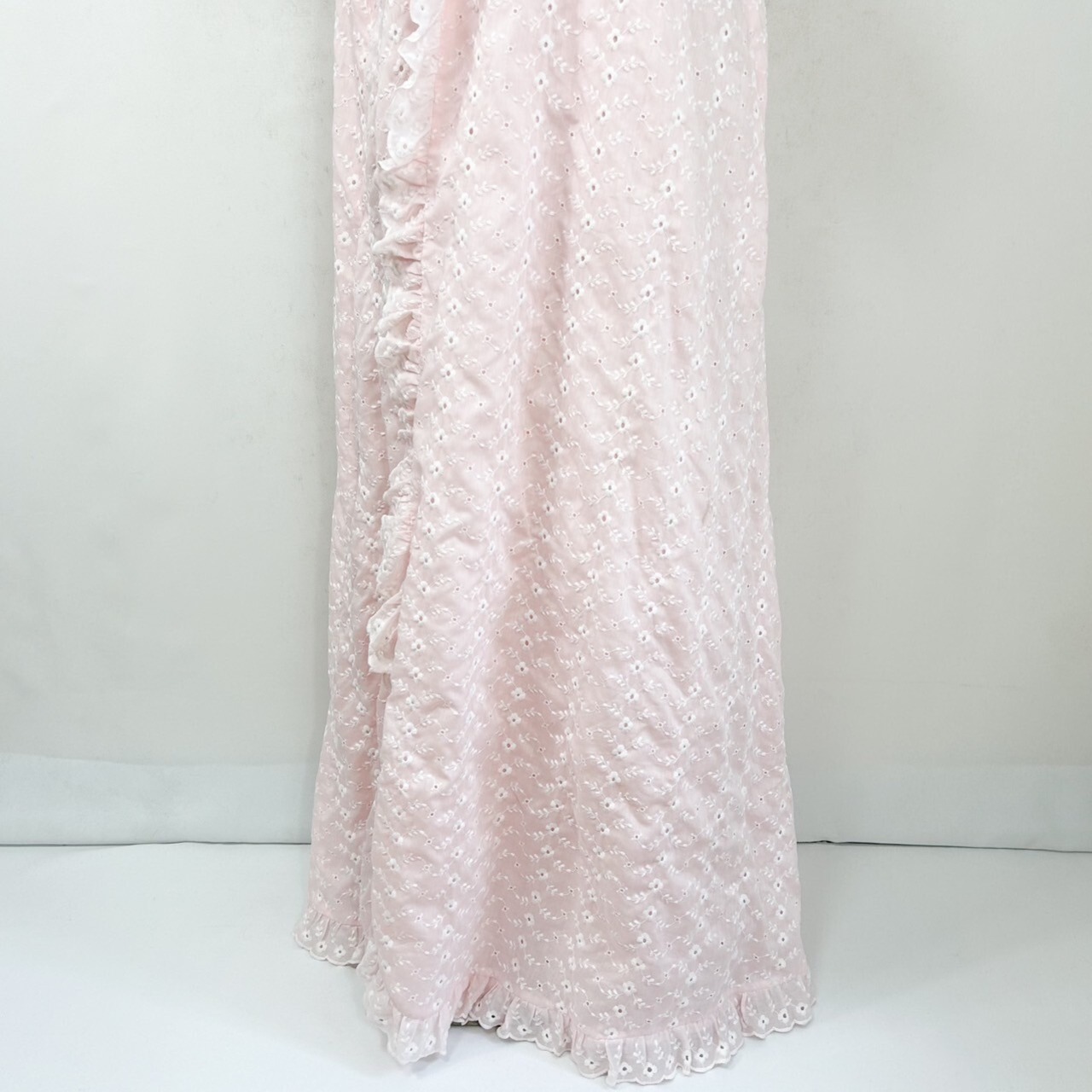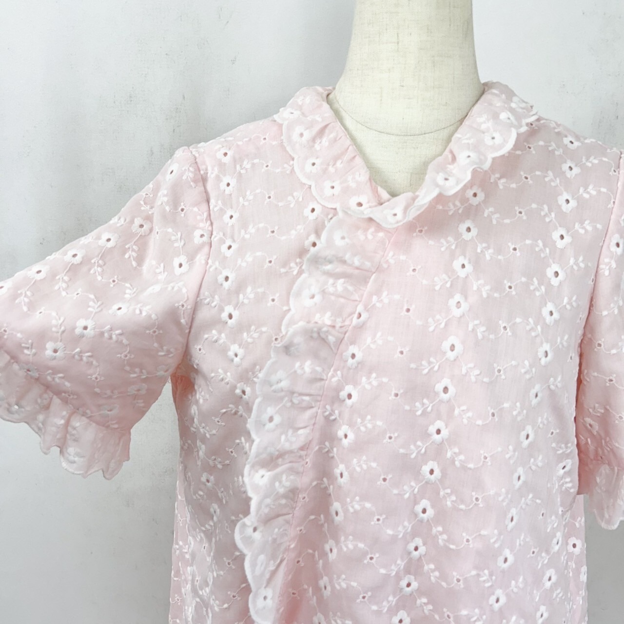 優しいピンクカラーにホワイトの花柄の総刺繍、フリルが端に施されていたりとラブリー好きにはたまりません。