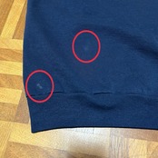 右肩、バック右袖、バック左肩2㎜〜8㎜程度のダメージ数カ所あり。お腹辺り、バック左袖、バック左裾辺りに薄汚れ数カ所あり。