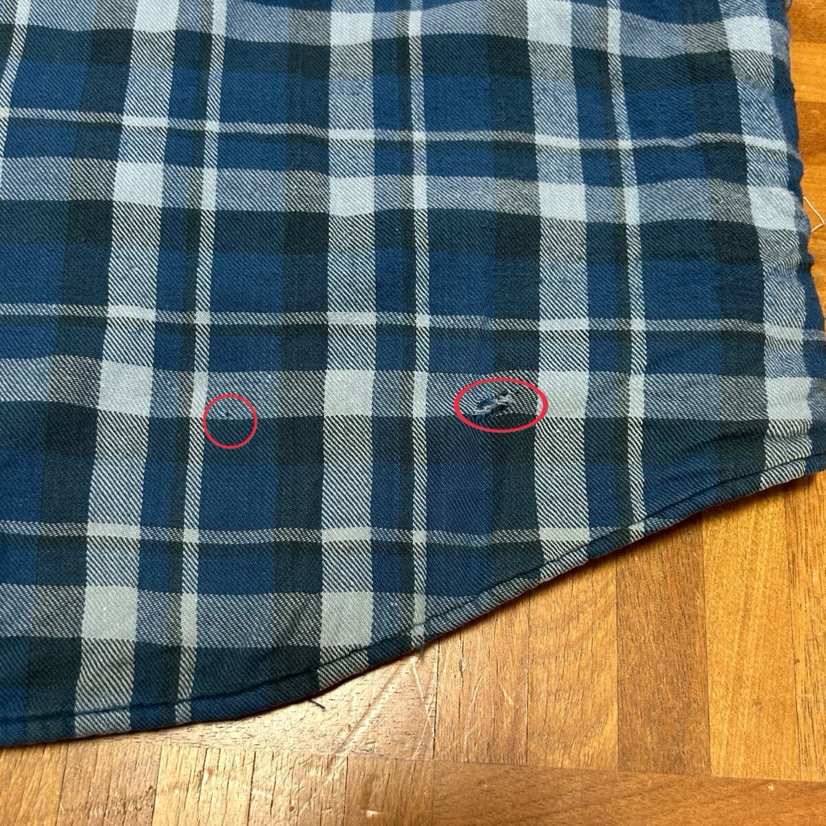 左裾1㎜〜1.5㎝程度のダメージ数カ所あり。右首元横生地引けあり。襟、右袖先、右胸ポケット横、ボタン1番下横に薄汚れ数カ所あり。全体的に薄っすら毛羽立ちあり。
