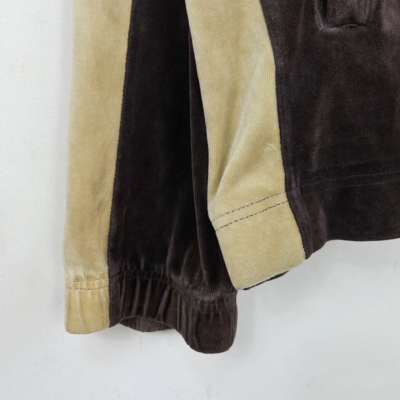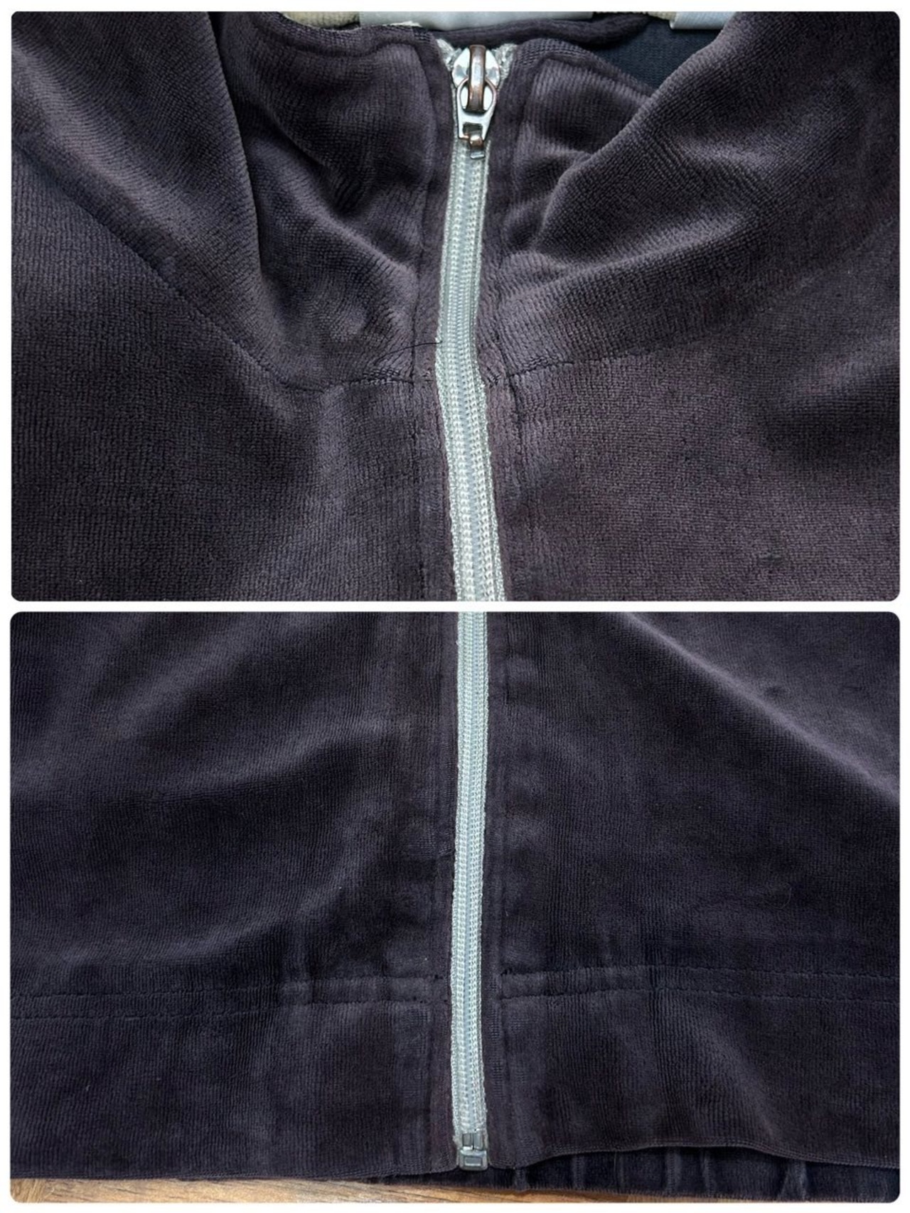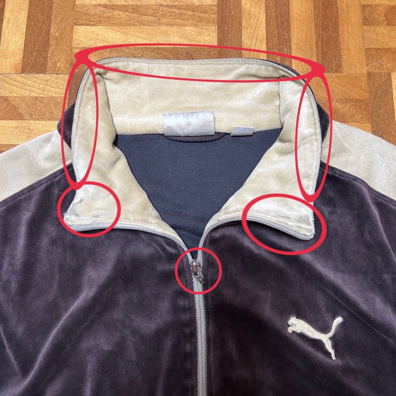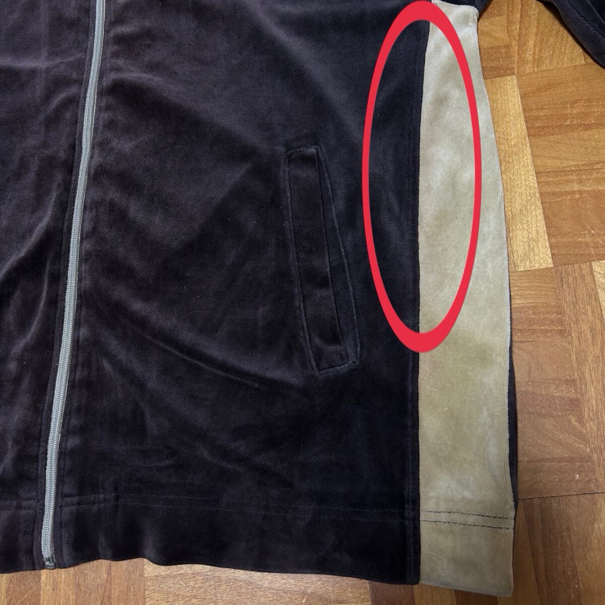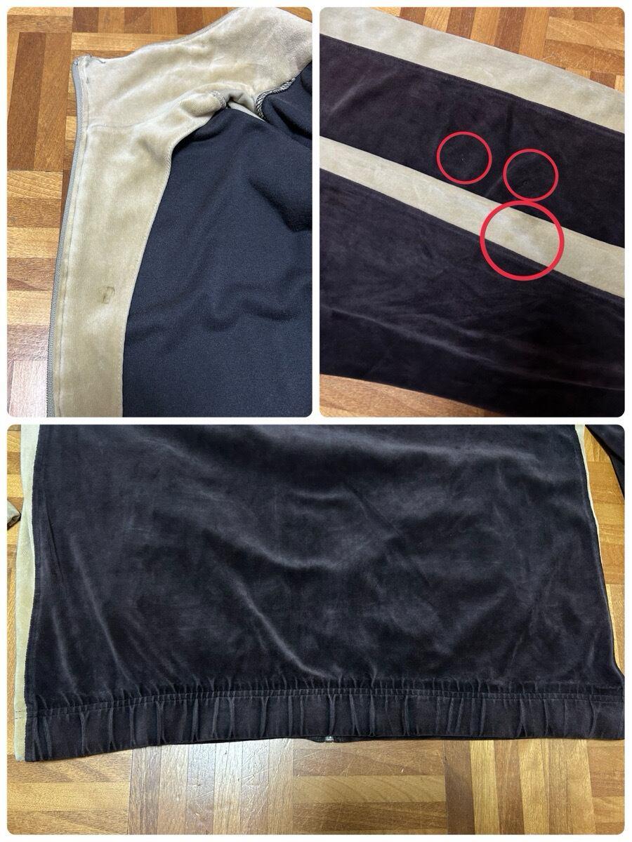 フロントジップの先ありません。袖先、バック裾のゴム伸びています。首周り、首元内側、袖先、左胸辺りベロア生地が薄くなっています。袖、左サイド、右胸内側に薄汚れ数カ所あり。左脇色褪せあり。