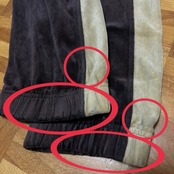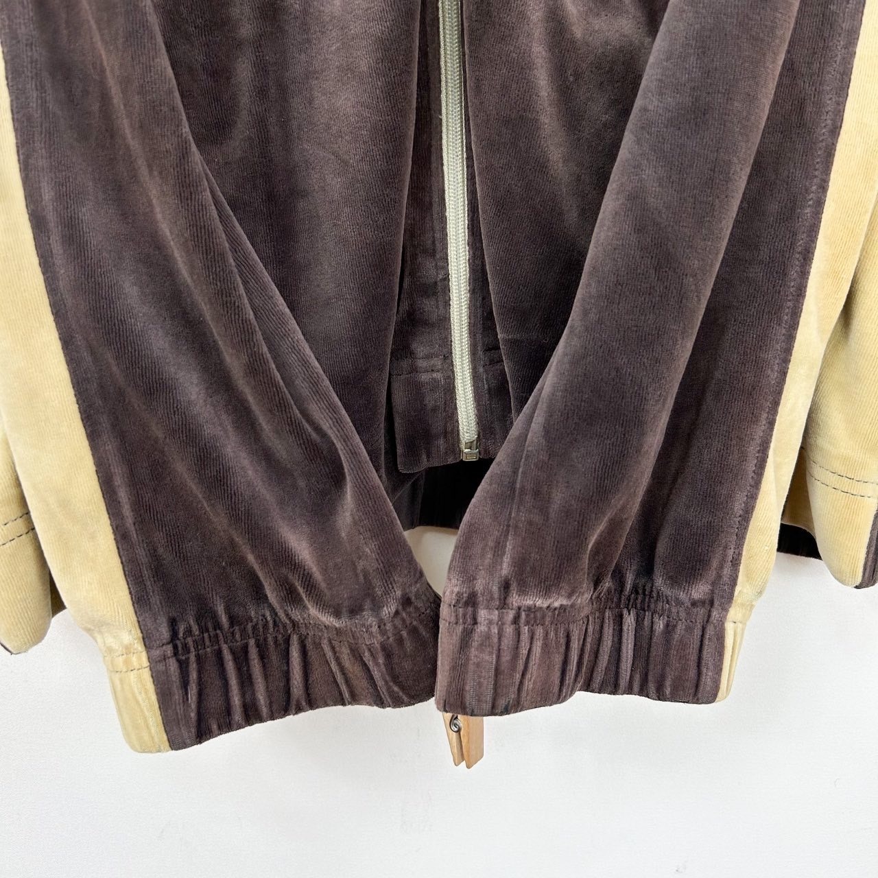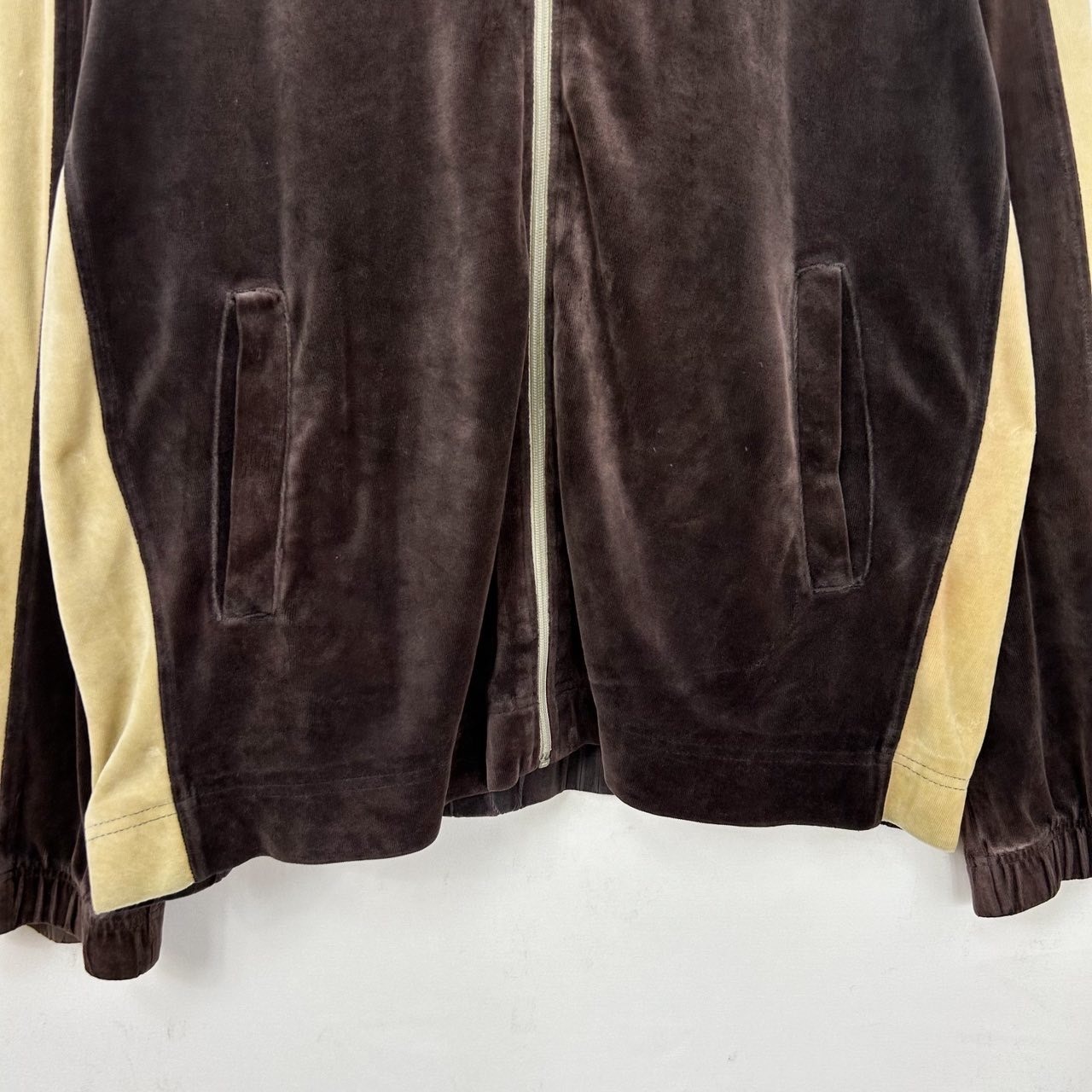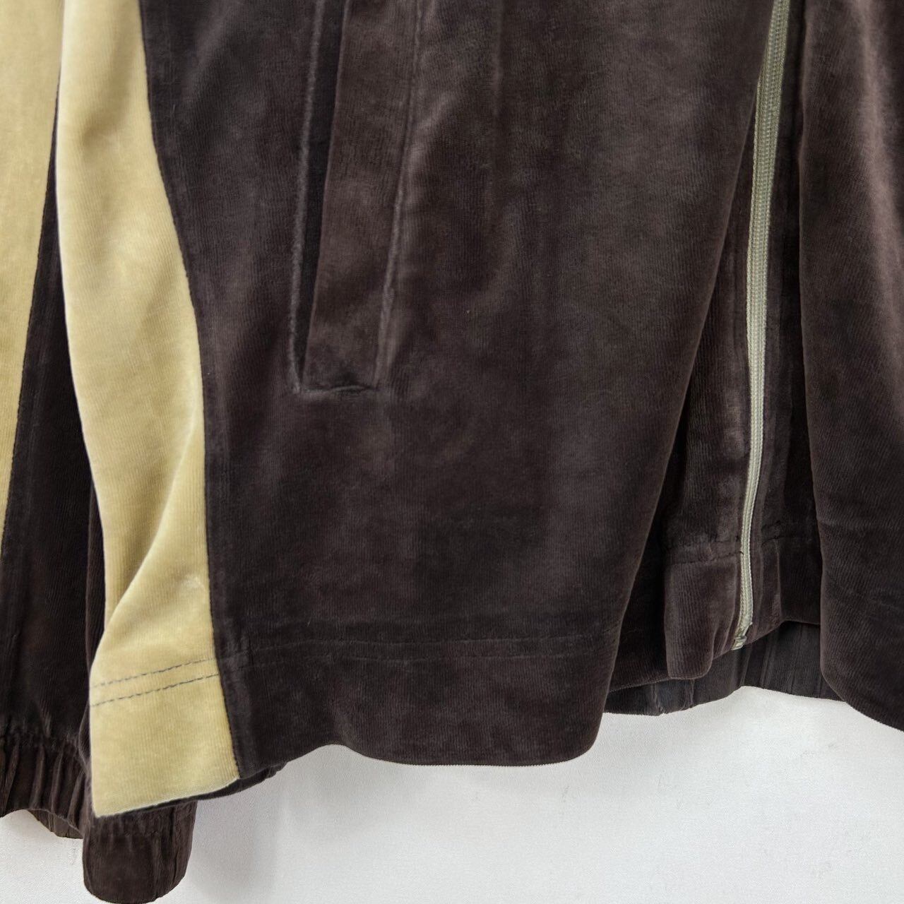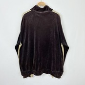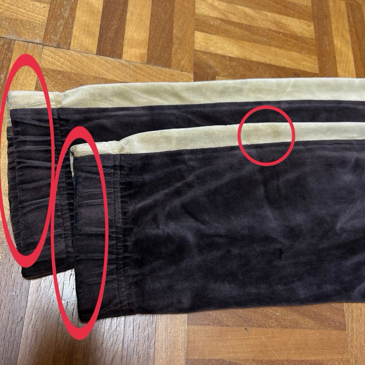 フロントジップの先ありません。袖先、バック裾のゴム伸びています。首周り、首元内側、袖先、左胸辺りベロア生地が薄くなっています。袖、左サイド、右胸内側に薄汚れ数カ所あり。左脇色褪せあり。