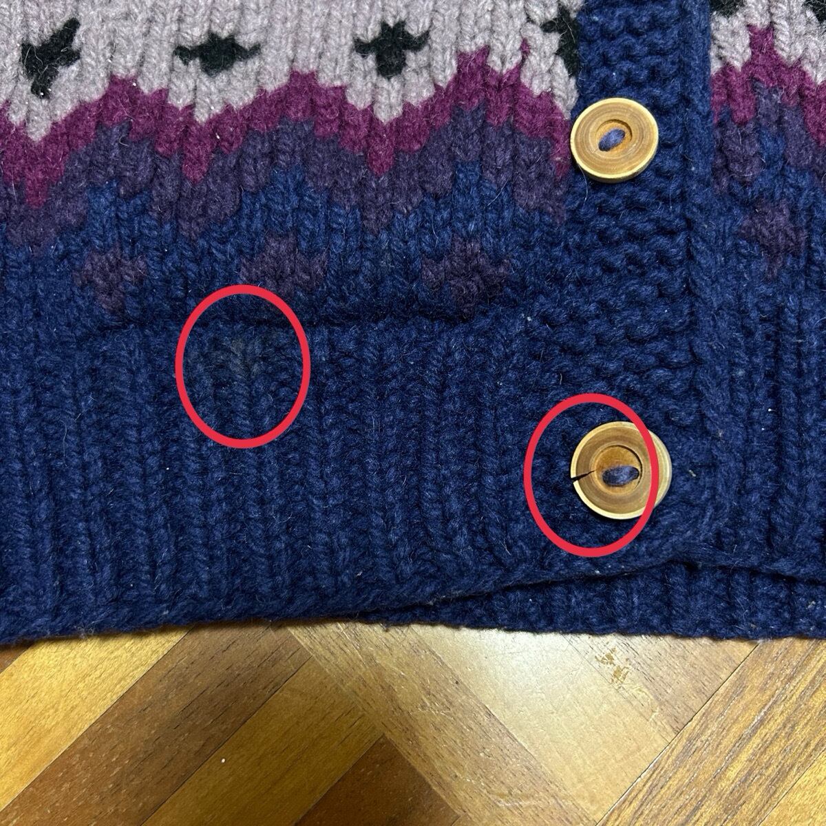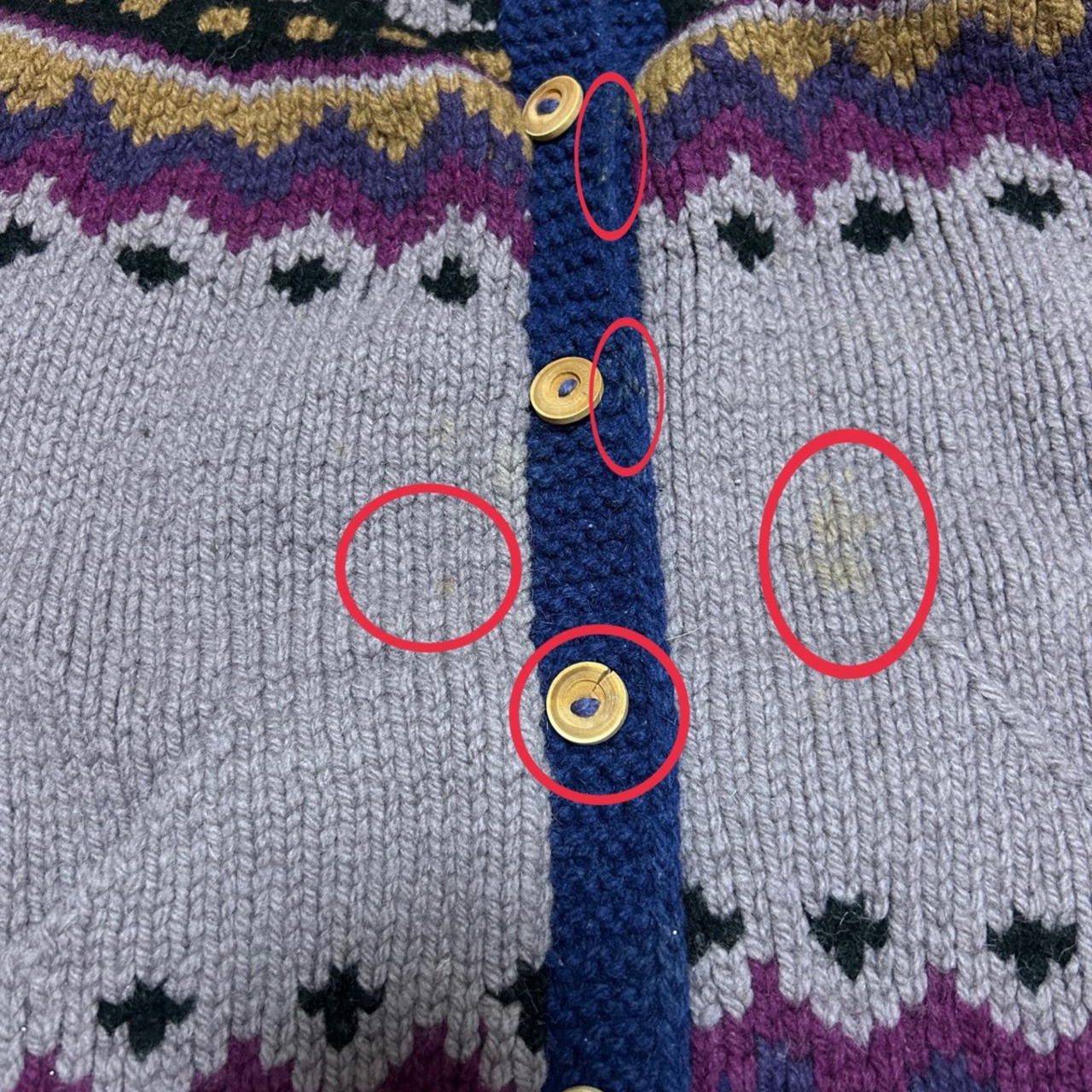 1番下、4番目のボタン割れあり。バック右袖先、裾、左お腹辺り、胸に薄汚れ複数カ所あり。多少の毛玉あり。