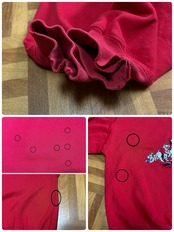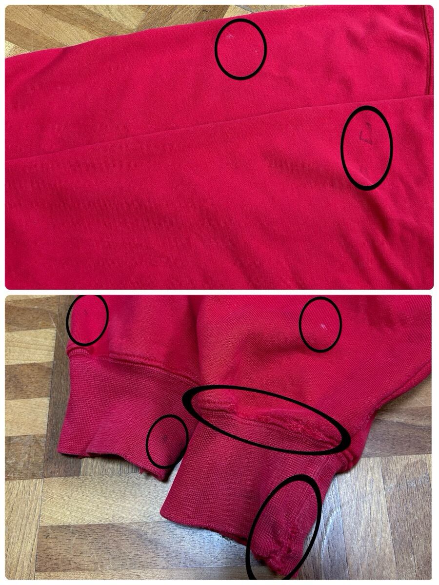 袖先リブ裂け数カ所あり。袖ダメージ数カ所あり。袖、左肩、右サイド、背中、バック右サイドに薄汚れ数カ所あり。