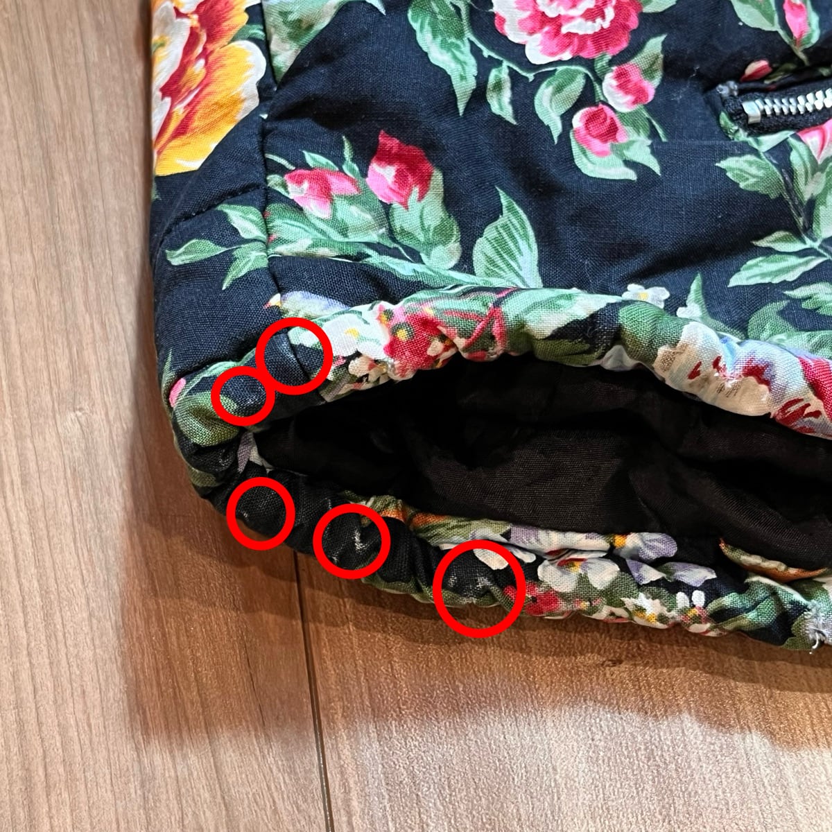 フロント裾部分にほつれあり。裾部分を中心に複数箇所1mm〜2mm程の破れあり。裾部分に複数箇所色褪せあり。フロント裾部分にほつれあり。