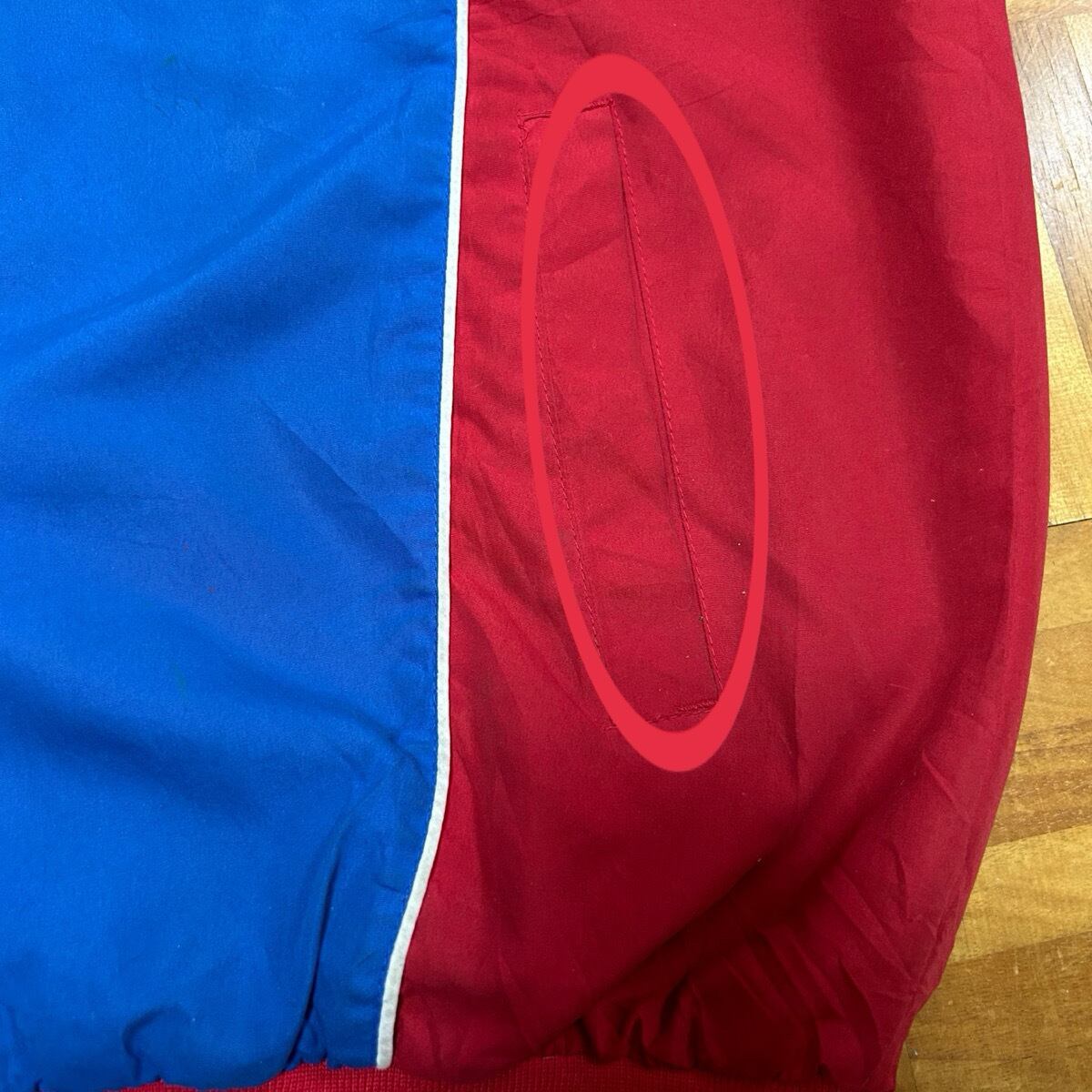 ジップ使えますが、裾ダメージあり。左袖先刺繍糸引けあり。袖、襟、右胸下、お腹、左右ポケット口、前後裾リブ、バック左右サイド裾上に薄汚れ数カ所あり。