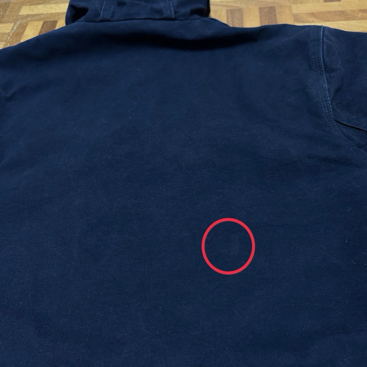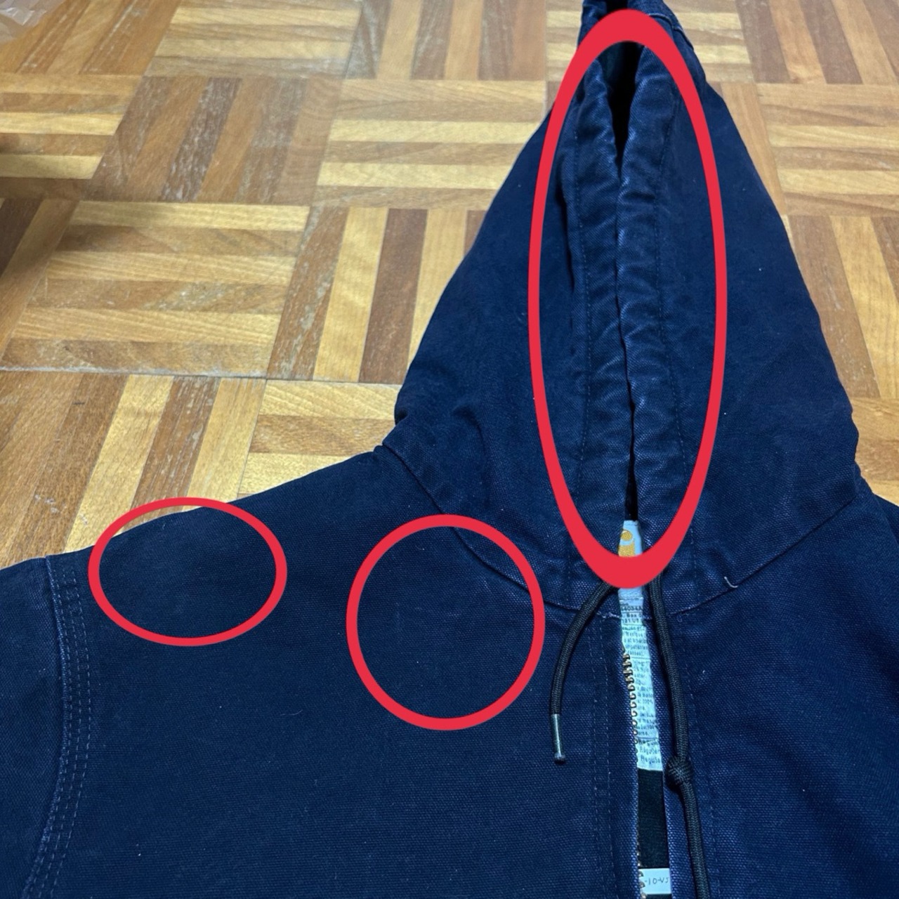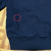 フード、袖、右首元、右肩、擦れで白っぽくなっているところ数カ所あり。袖、右ポケット、背中、バック左サイドに薄汚れ数カ所あり。