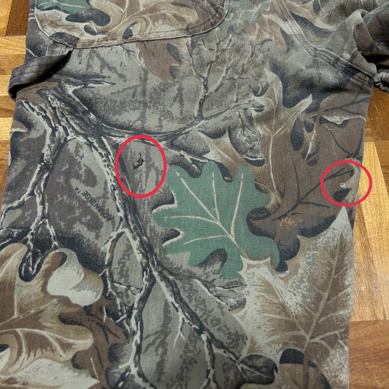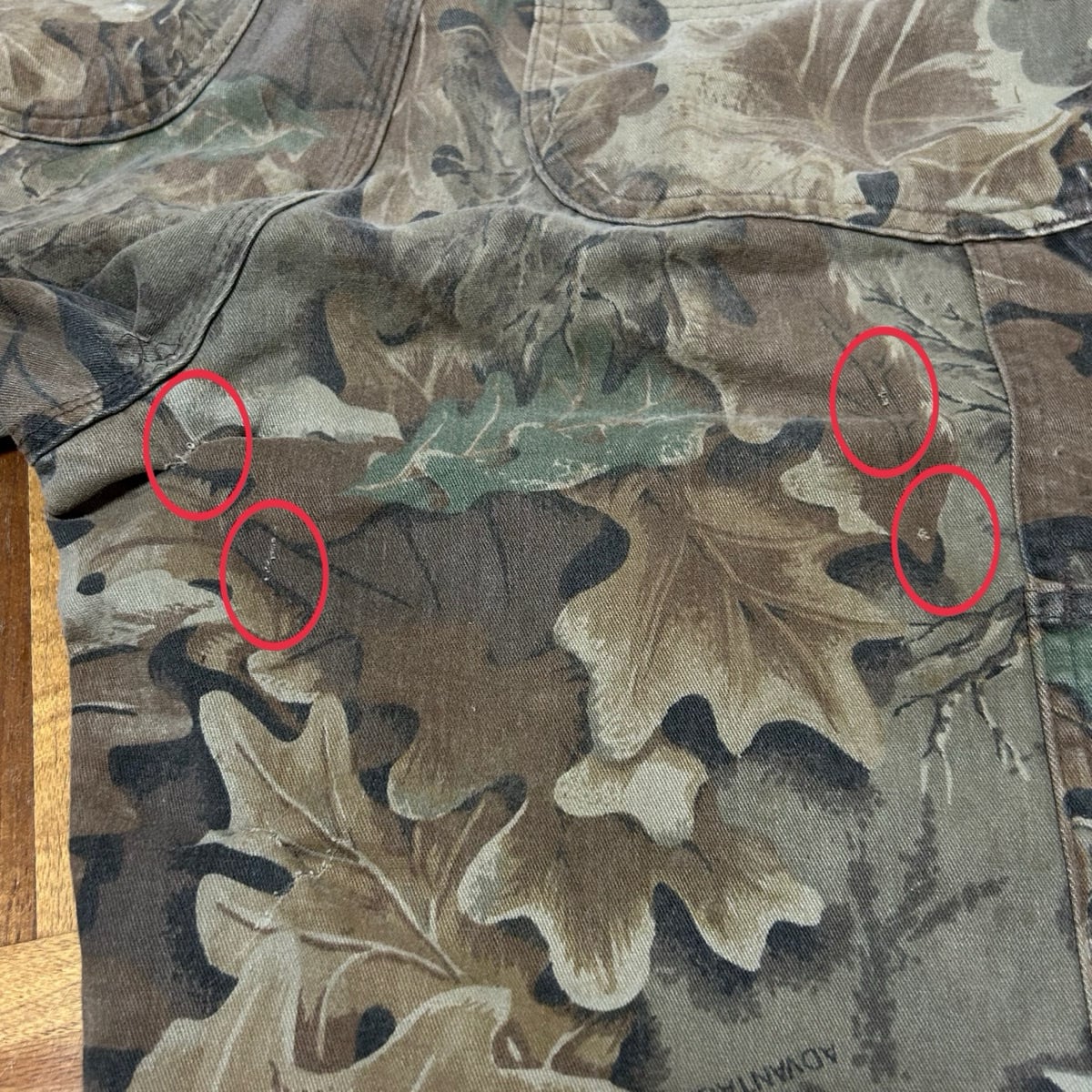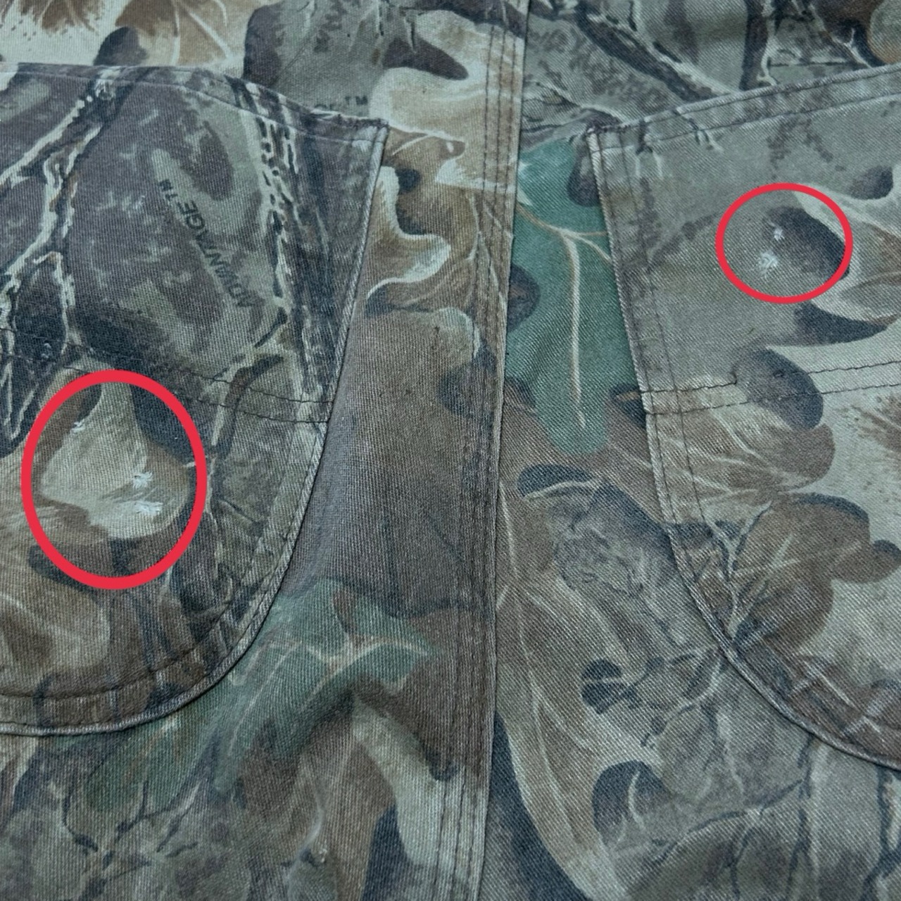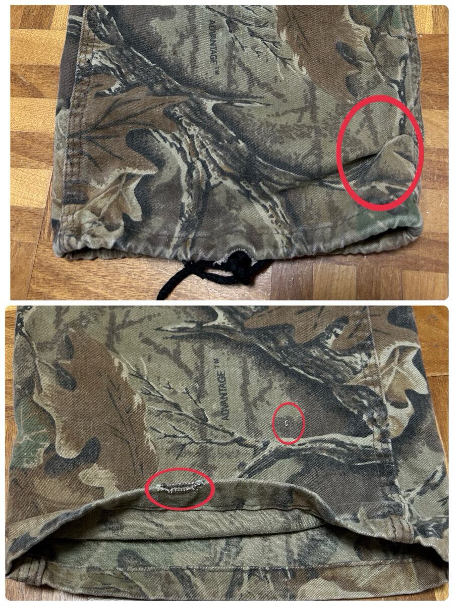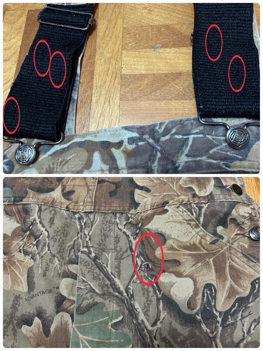 肩紐ゴム生地引け数カ所あり。左裾、左右ヒップポケット、バック左右太もも、バック右裾上に3㎜〜5㎜程度のダメージ数カ所あり。左裾紐無し。バック左太もも薄汚れあり。バック左太もも生地引けあり。左ウエスト下、右裾、バック右太ももにリペア跡数カ所あり。