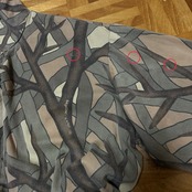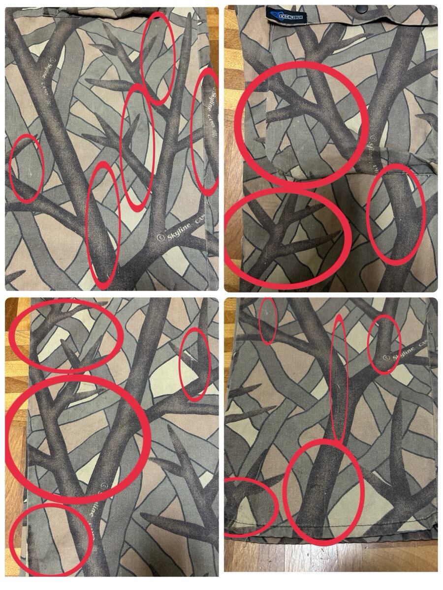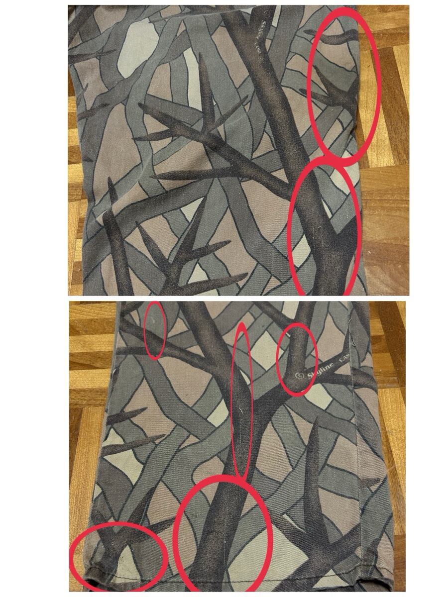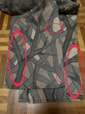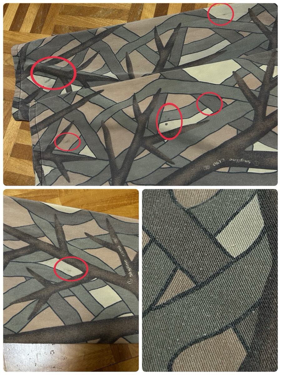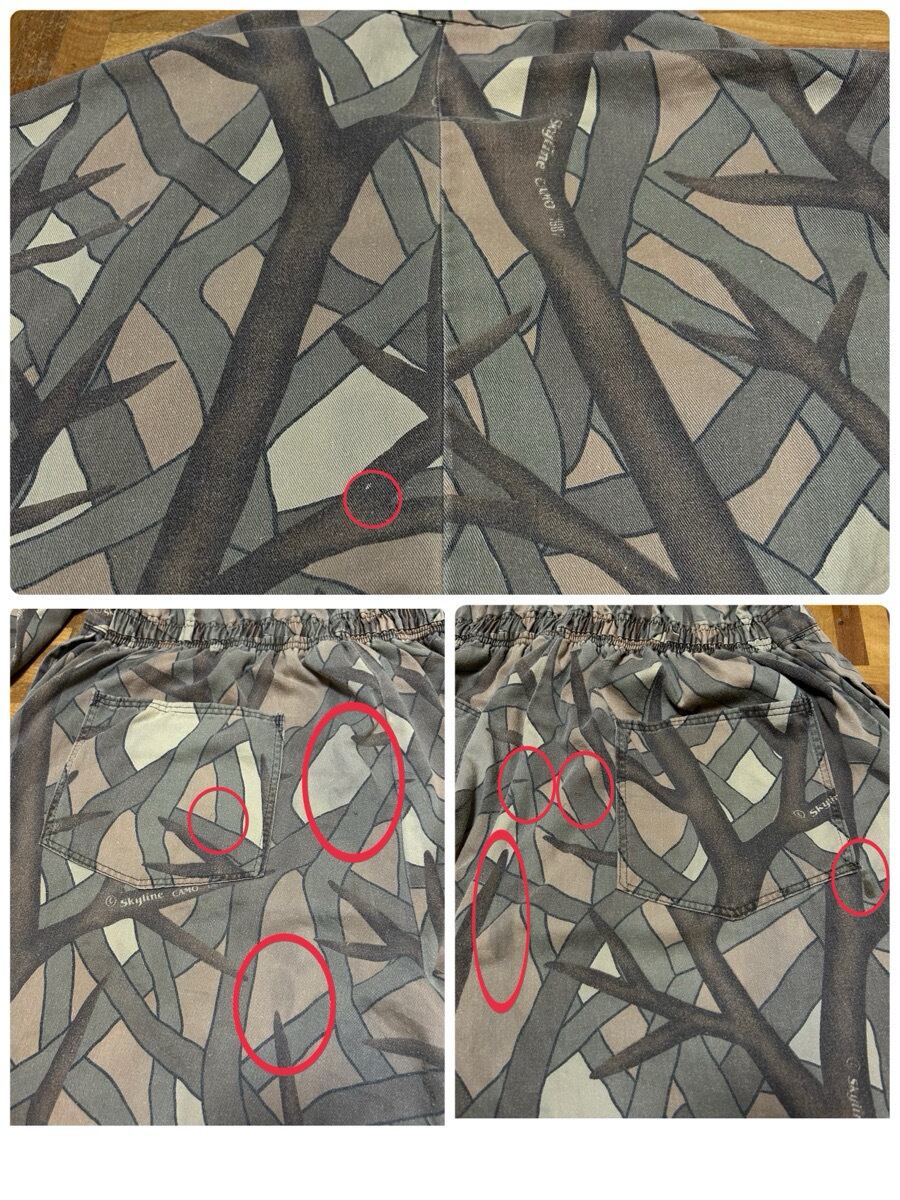 左袖、左肩、左右脚ポケット、前後左右膝辺り、左裾、バック裾に生地引けダメージあり。袖、左右太もも、膝、左裾、背中、ヒップ、バック裾辺りに薄汚れ数カ所あり。左脚ポケット5㎜〜1㎝程度のダメージ数カ所あり。全体的に薄っすら毛羽立ちあり。