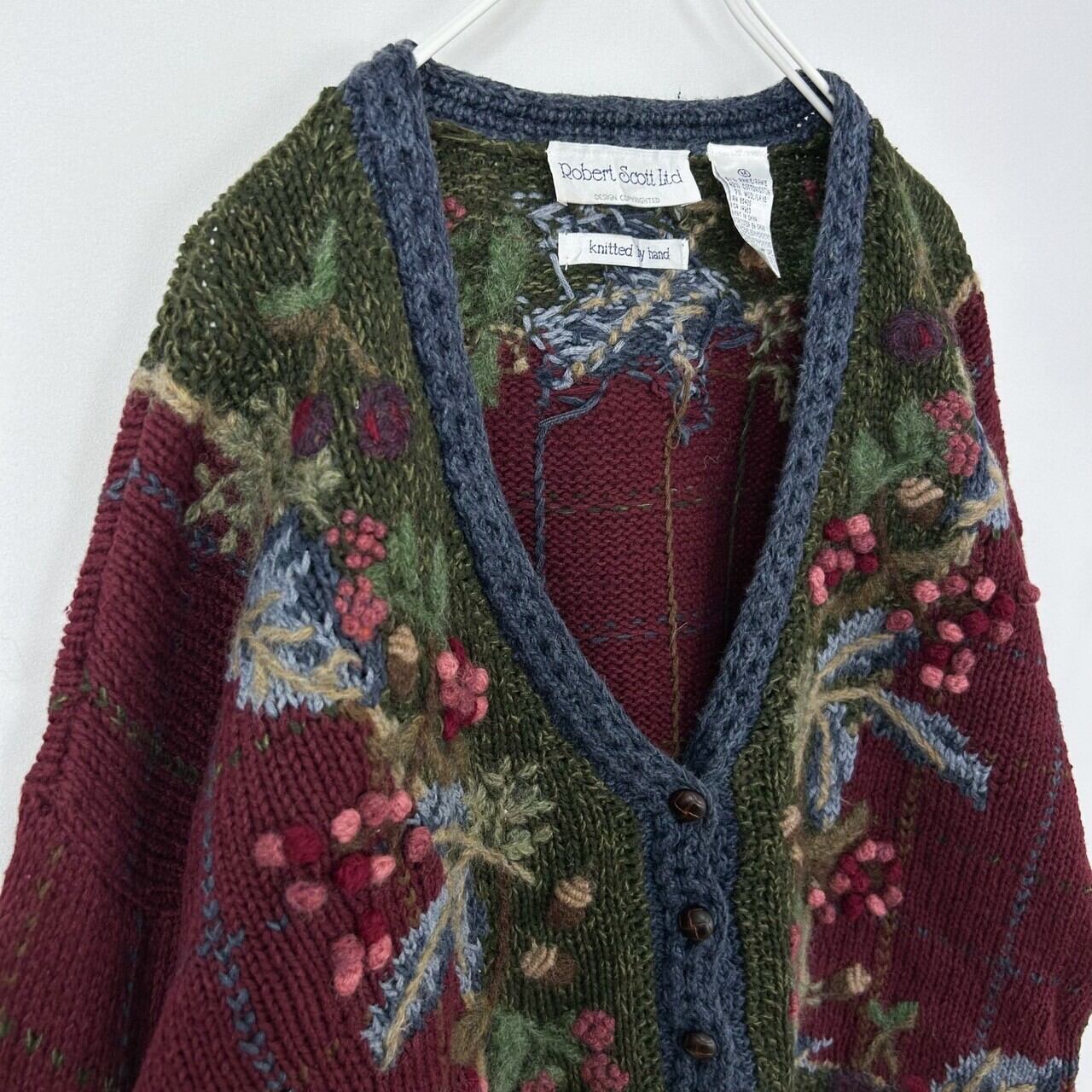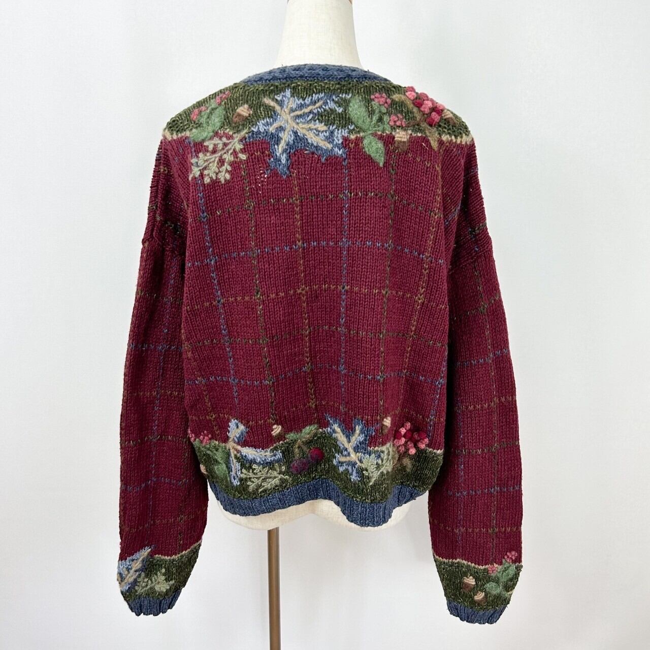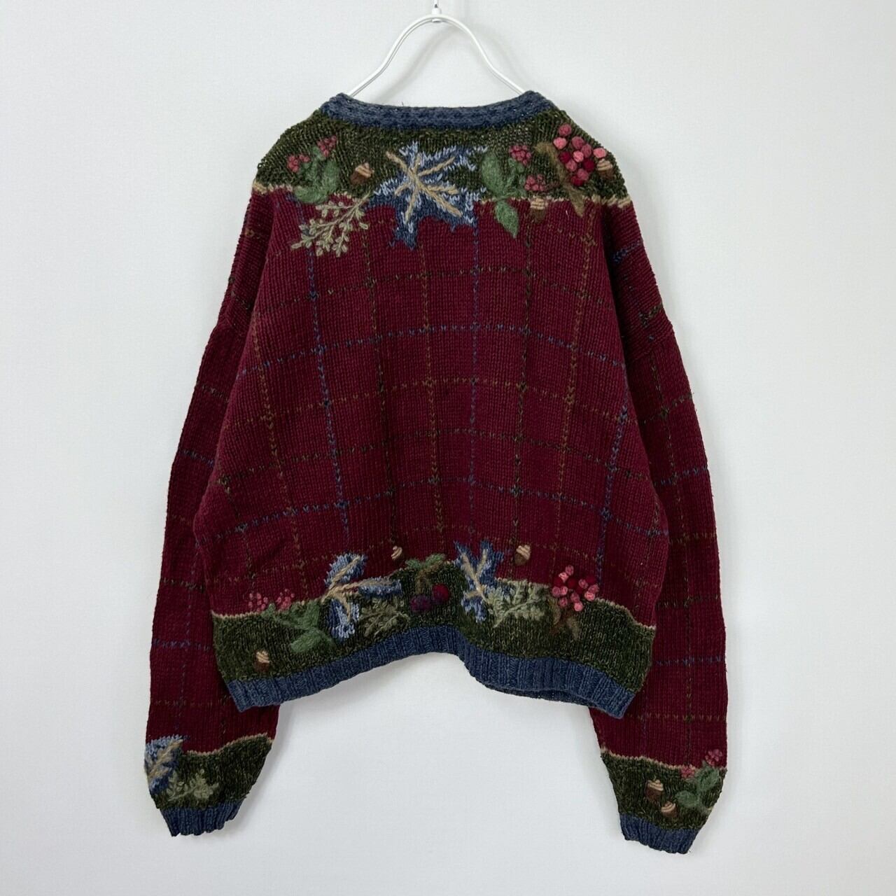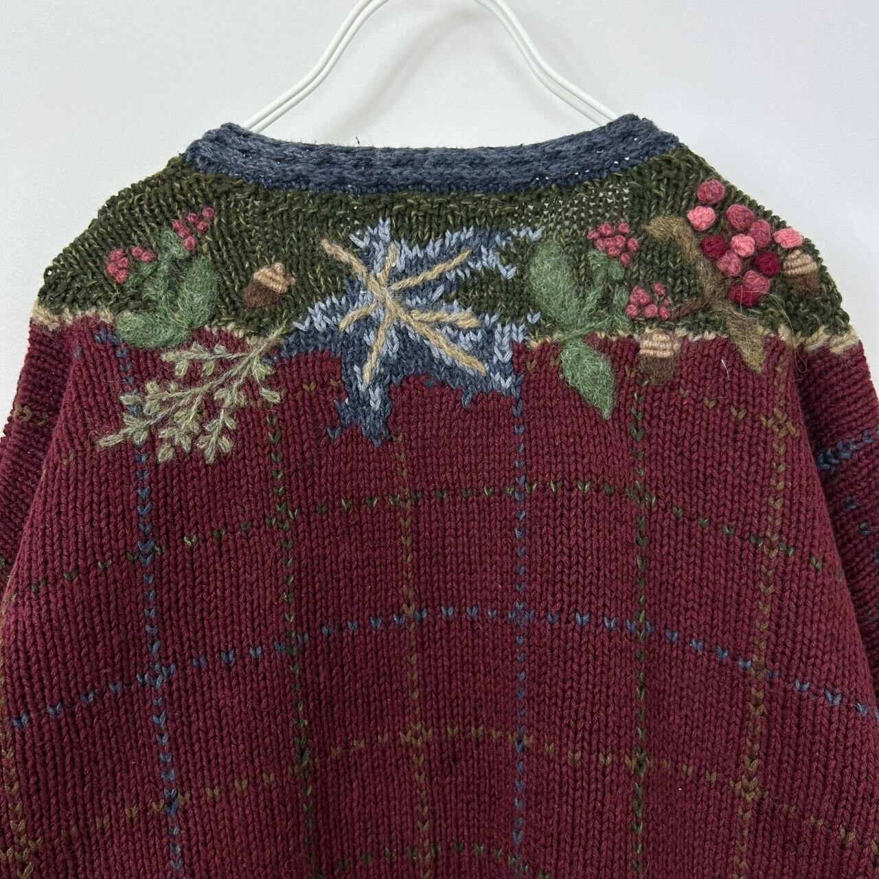 木の実 3D 立体 刺繍 総柄 チェック ラミー コットン ウール ハンドニット セーター カーディガン