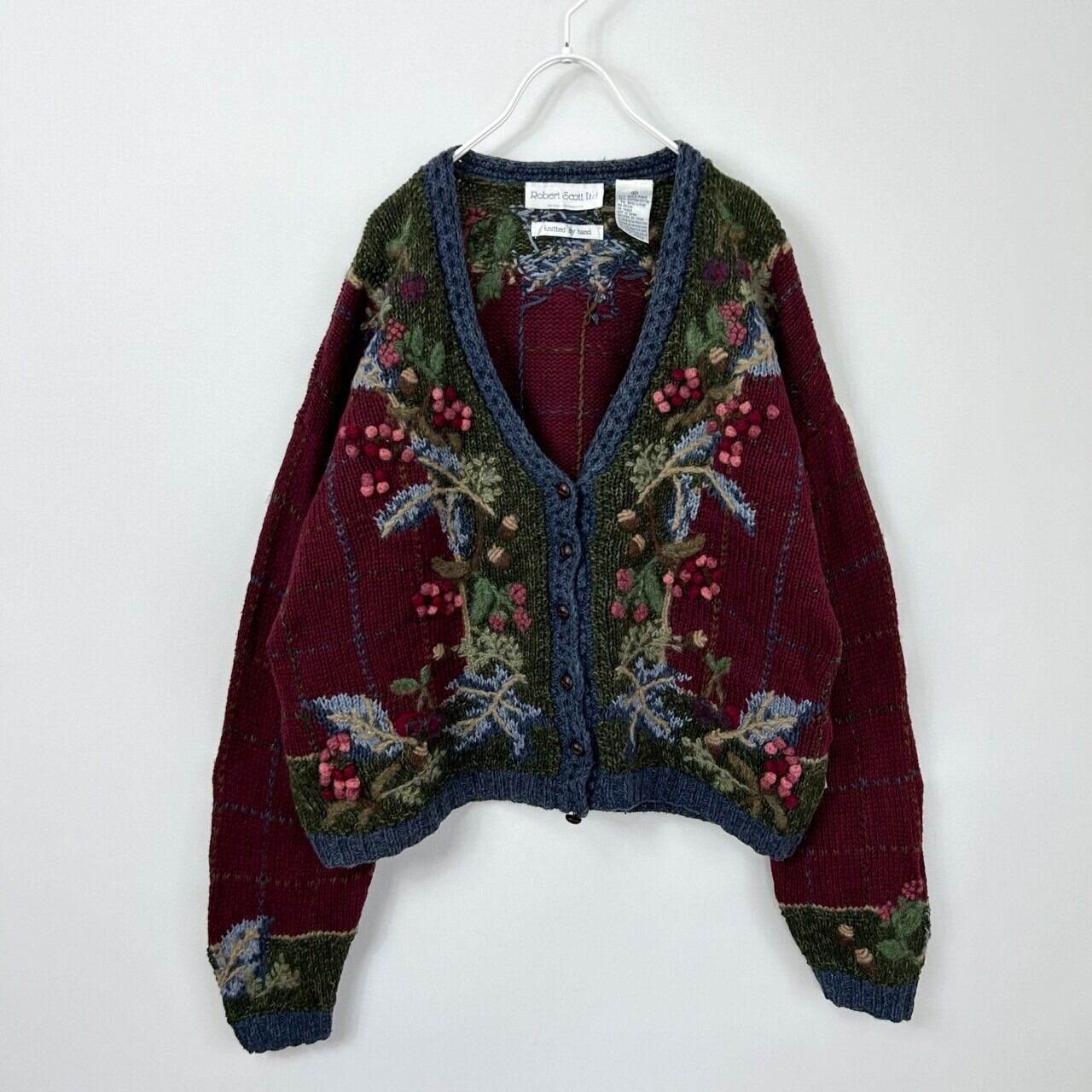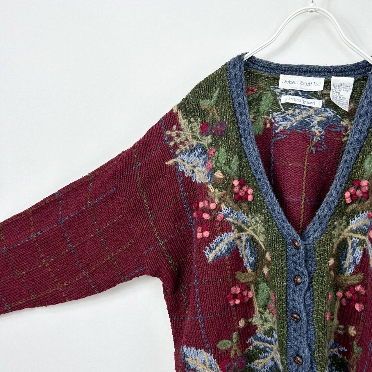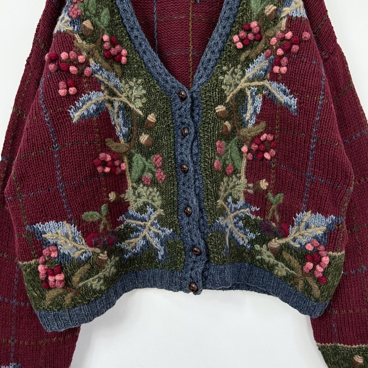 木の実 3D 立体 刺繍 総柄 チェック ラミー コットン ウール ハンドニット セーター カーディガン