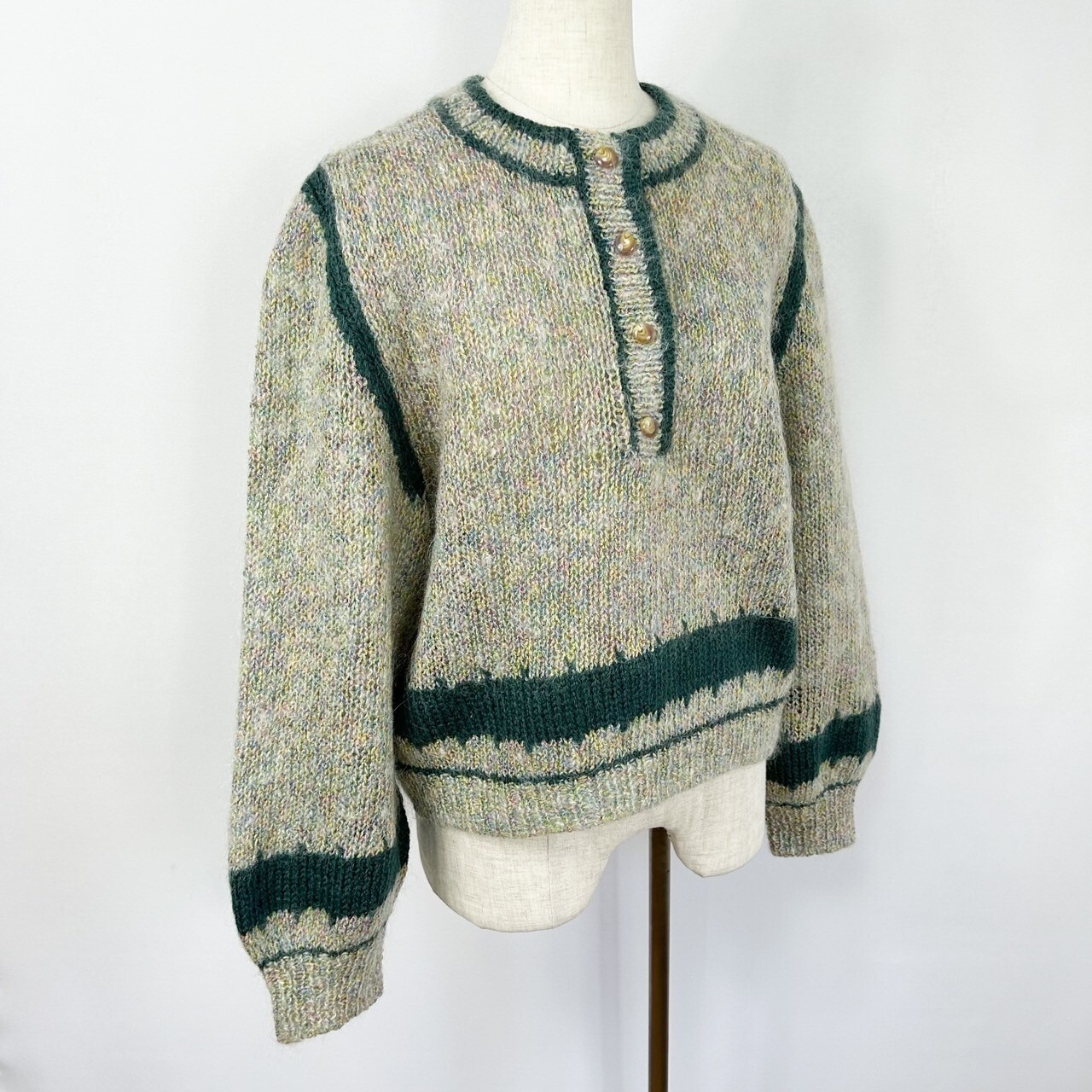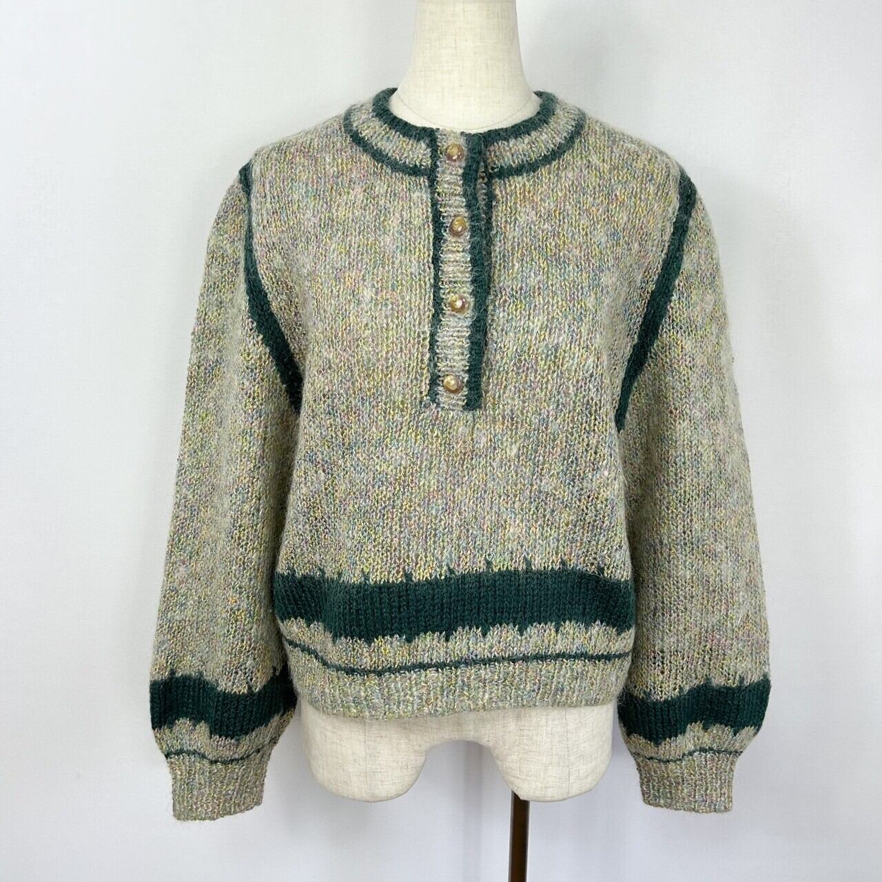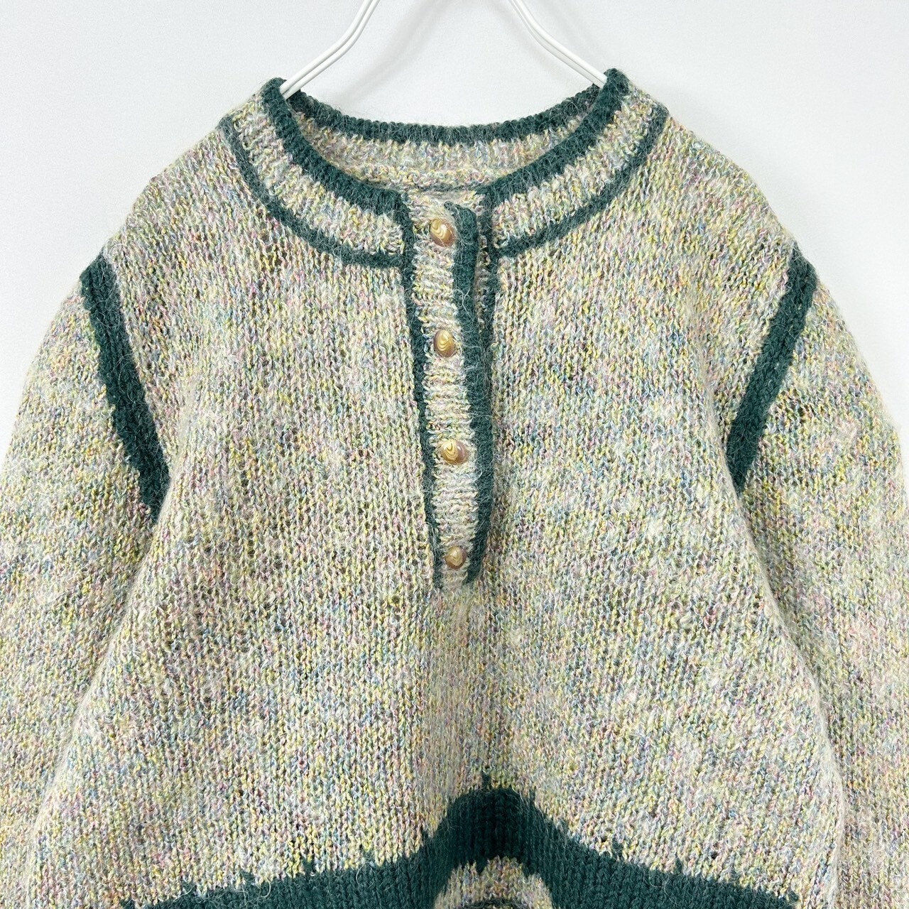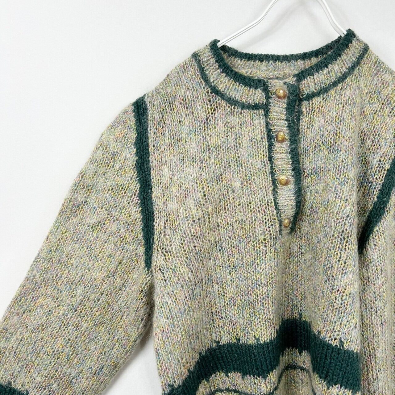 ハーフボタン ツートンカラー ミックスニット モヘア混 ハンドニット セーター