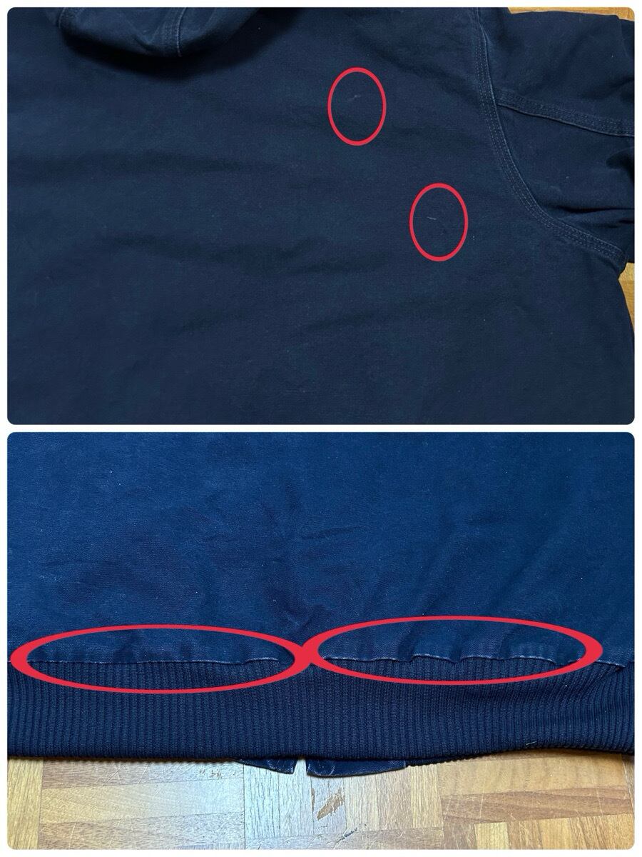 バック左袖1㎝程度のダメージあり。フード周り、袖、裾辺りに擦れで白っぽくなっているところ数カ所あり。フード、袖、胸ワッペン、右肩下、ポケット辺り、背中に薄汚れ数カ所あり。