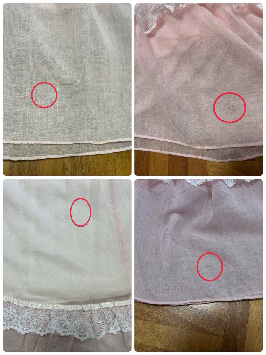 透け感あるので、ペチコート着用下さい。右袖、バック右肩下、左裾生地引け数カ所あり。右裾に1㎝程度のダメージあり。