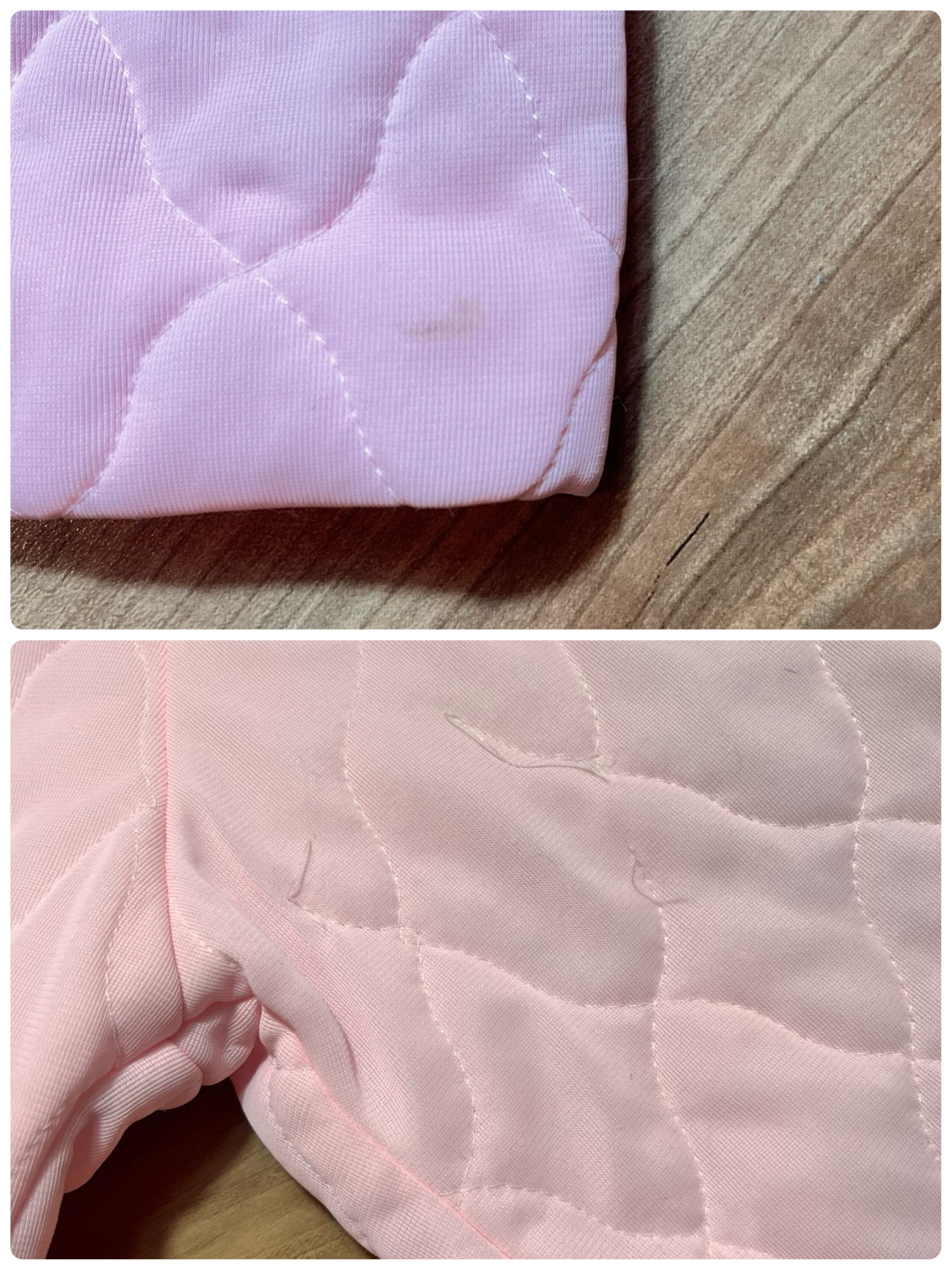 フロント右太もも部分に薄汚れあり。フロント中央下部分に薄汚れあり。フロント裾部分にほつれあり。背面左肩部分に2箇所ほつれあり。背面右肩部分に2箇所ほつれあり。背面右袖部分に3箇所ほつれあり。背面右裾部分に薄汚れあり。