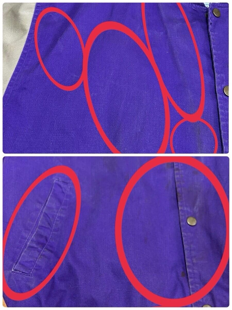 左右袖5㎜程度のダメージ数カ所あり。前後肩、前後首周り、フロントボタン辺り、ポケット口、バック裾擦れで白っぽくなっています。袖、左肩、胸、お腹、裾、バックワッペン薄汚れ数カ所あり。