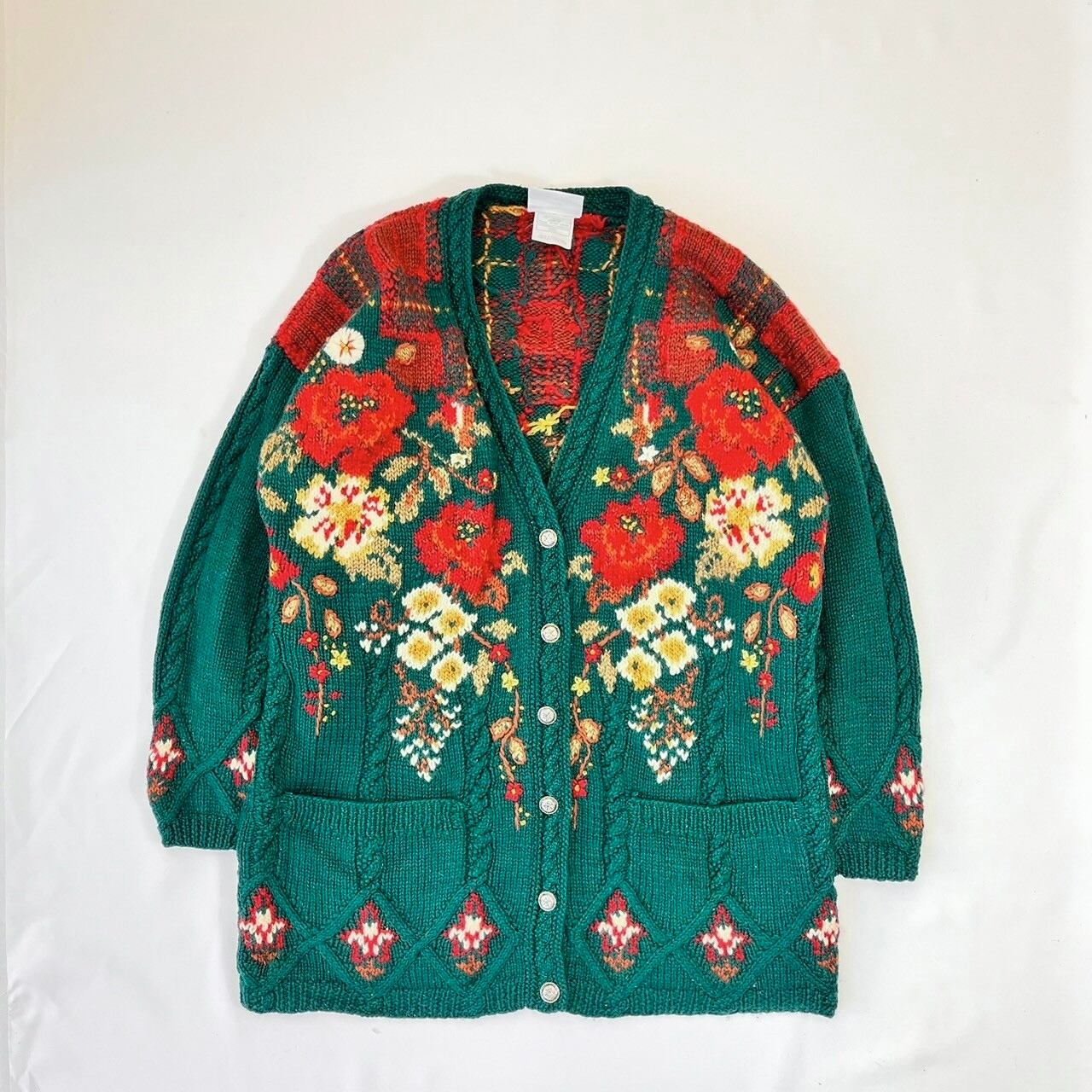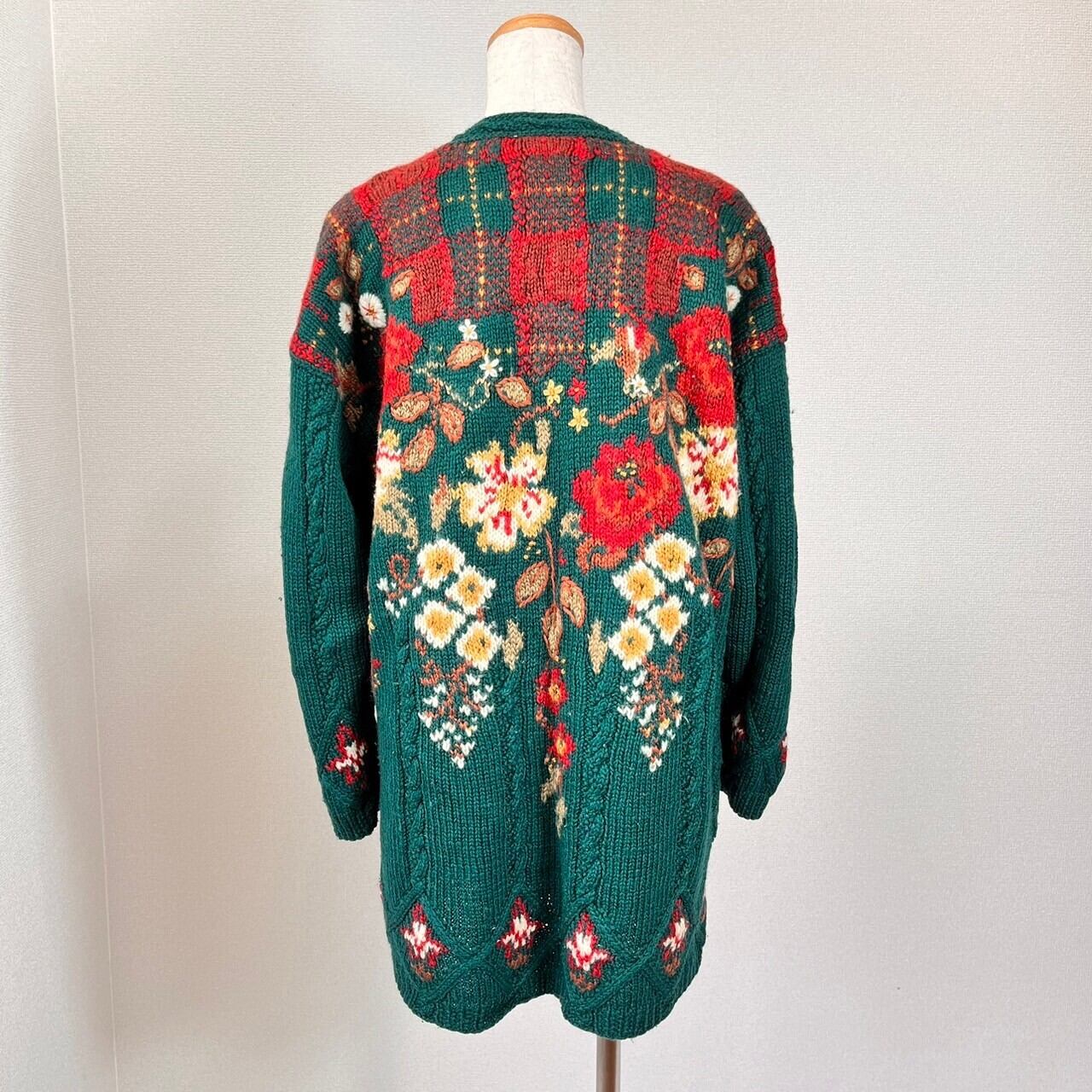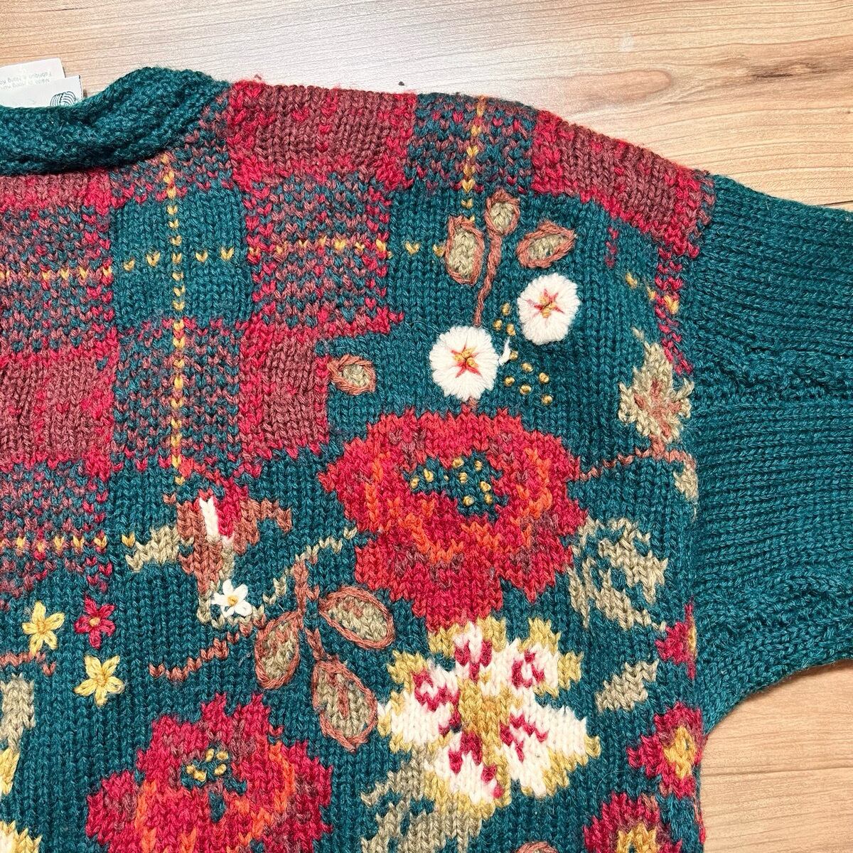 Laura Ashley ローラアシュレイ 花柄 チェック 総柄 刺繍 エンブロイダリー デザインボタン メタルボタン ウール ニット カーディガン セーター