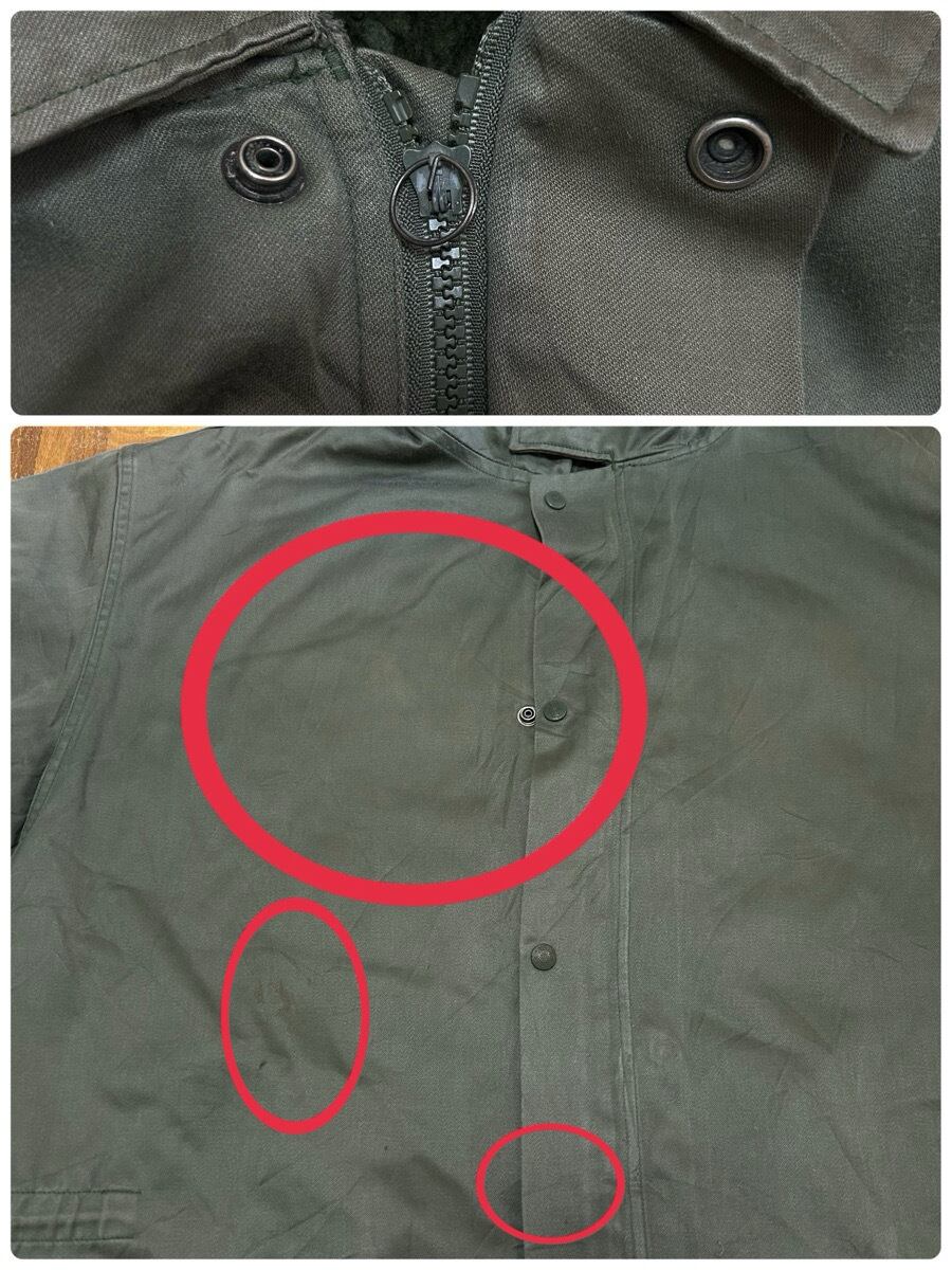 フード生地引けダメージあり。フード、胸辺り、背中に色褪せ数カ所あり。右お腹辺り、右下ポケット、前後裾上に薄汚れ数カ所あり。フロントボタンあたりの様な跡数カ所あり。右袖生地引けあり。ライナーフード薄汚れあり。