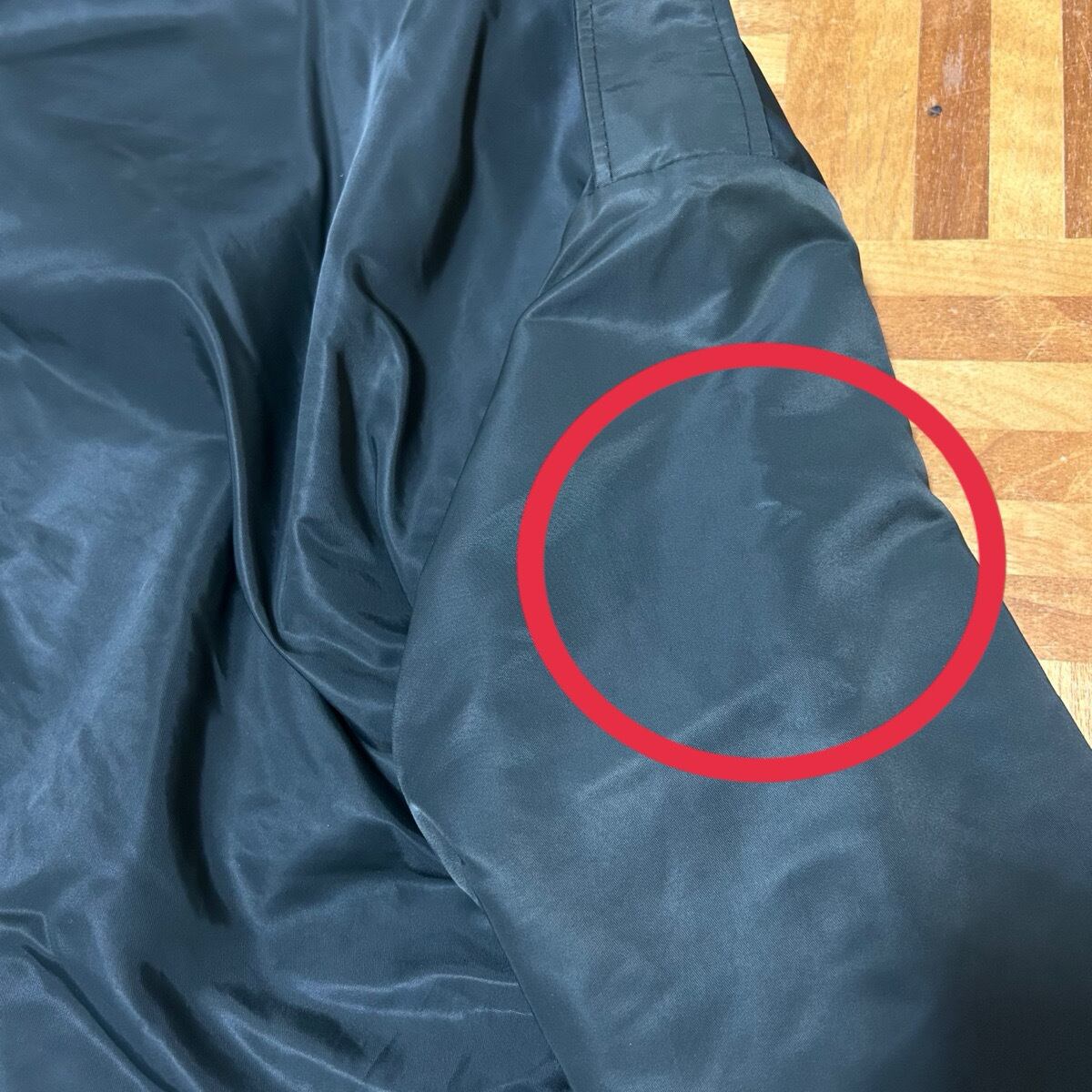 左袖2㎜程度のダメージ数カ所あり。右袖ワッペンのついていた跡あり。左袖、裏地首周り、裏地首元変色あり。全体に少し色褪せあり。