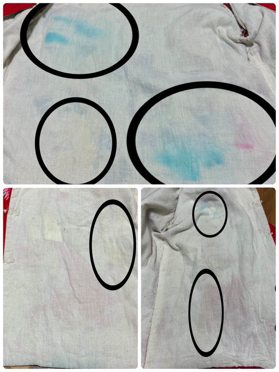 左袖、胸、お腹、裾、背中、バック裾上辺りに薄汚れ数カ所あり。胸、バック左肩、背中、バック裾上、刺繍糸引け数カ所あり。