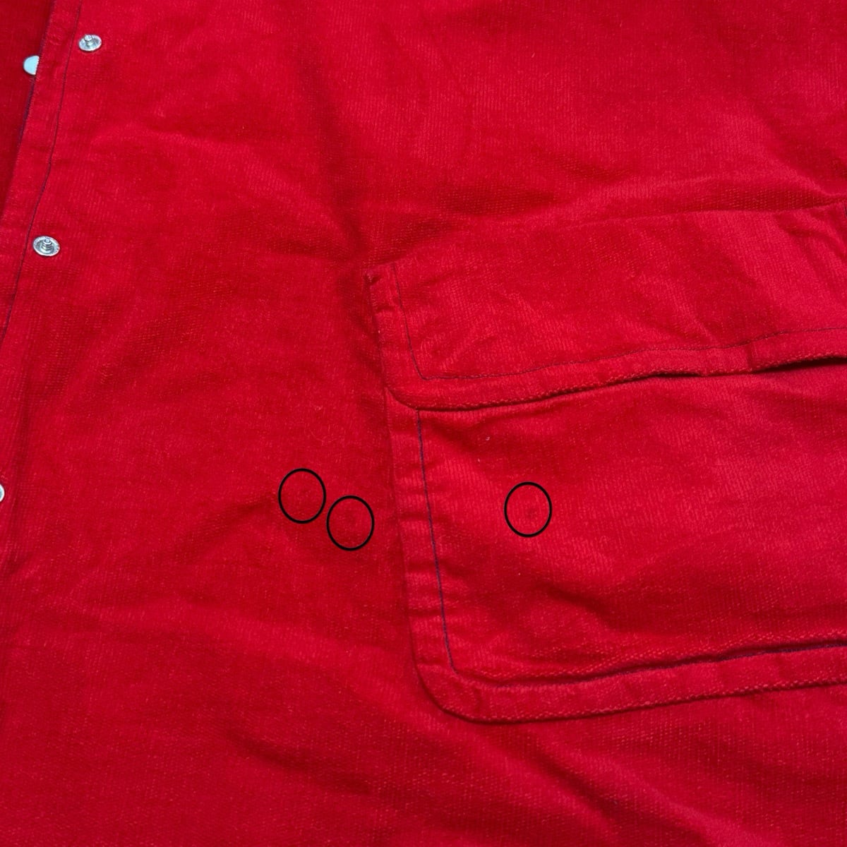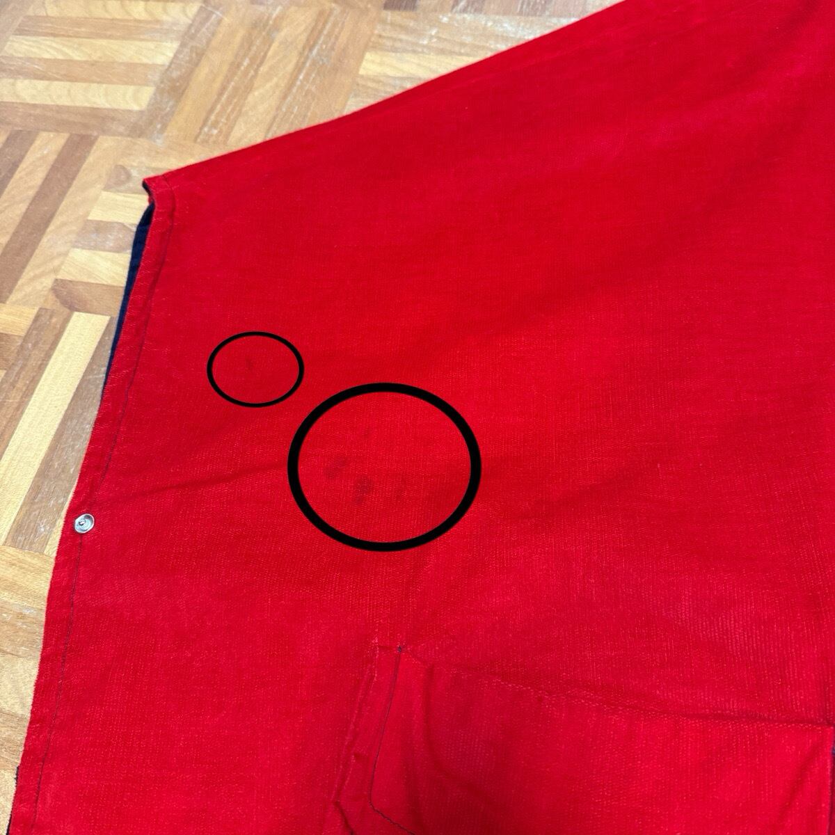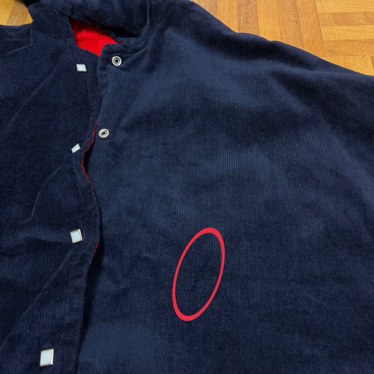 赤:右袖先、お腹辺り、左ポケット辺りに薄汚れ数カ所あり。