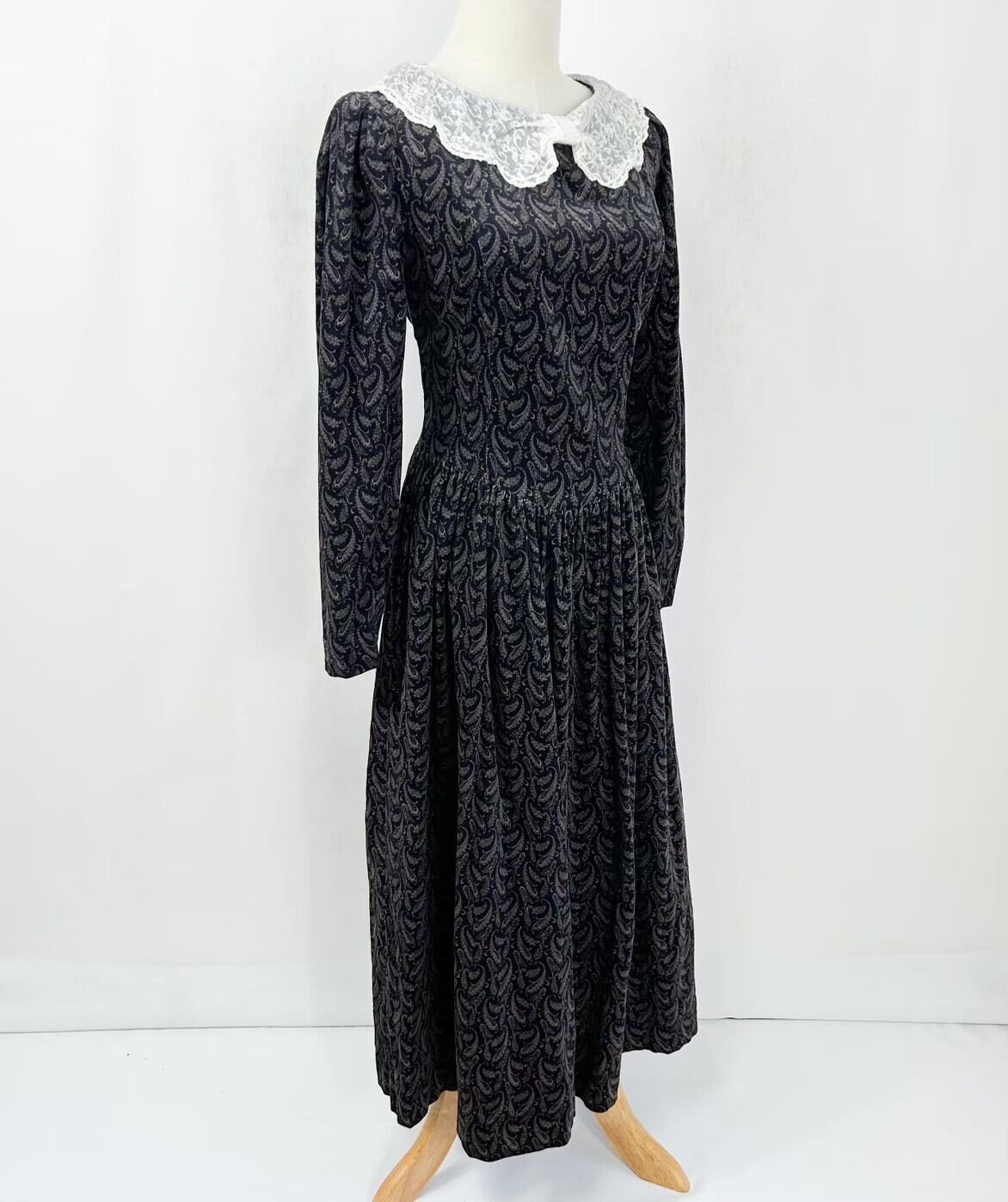80s made in Great Britain Laura Ashley lace collar paisley pattern corduroy dress